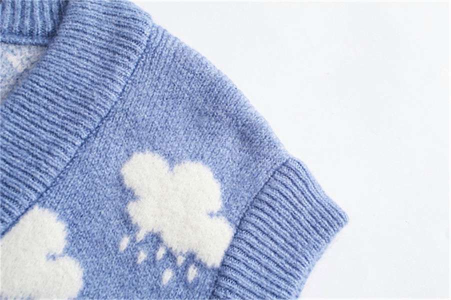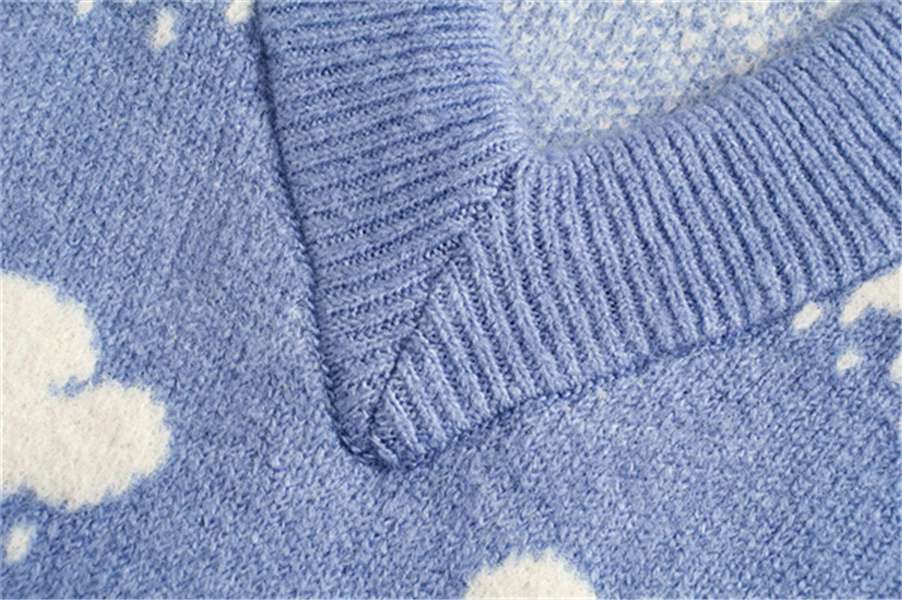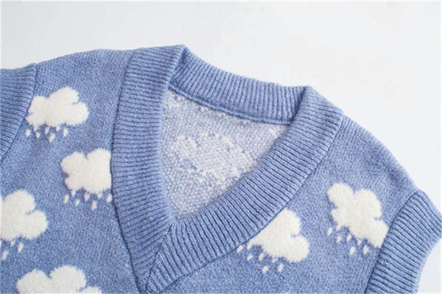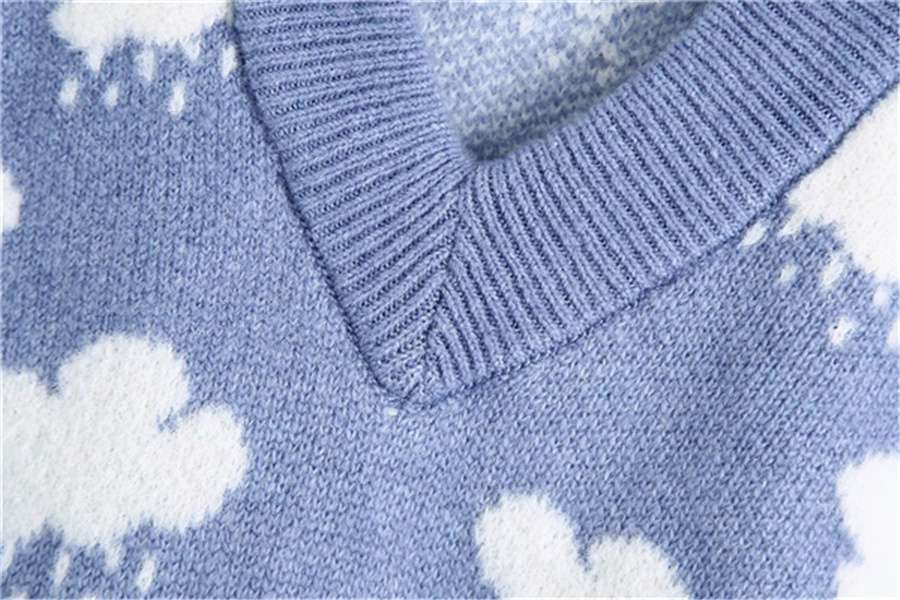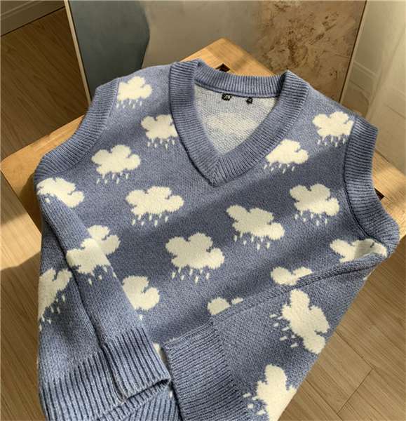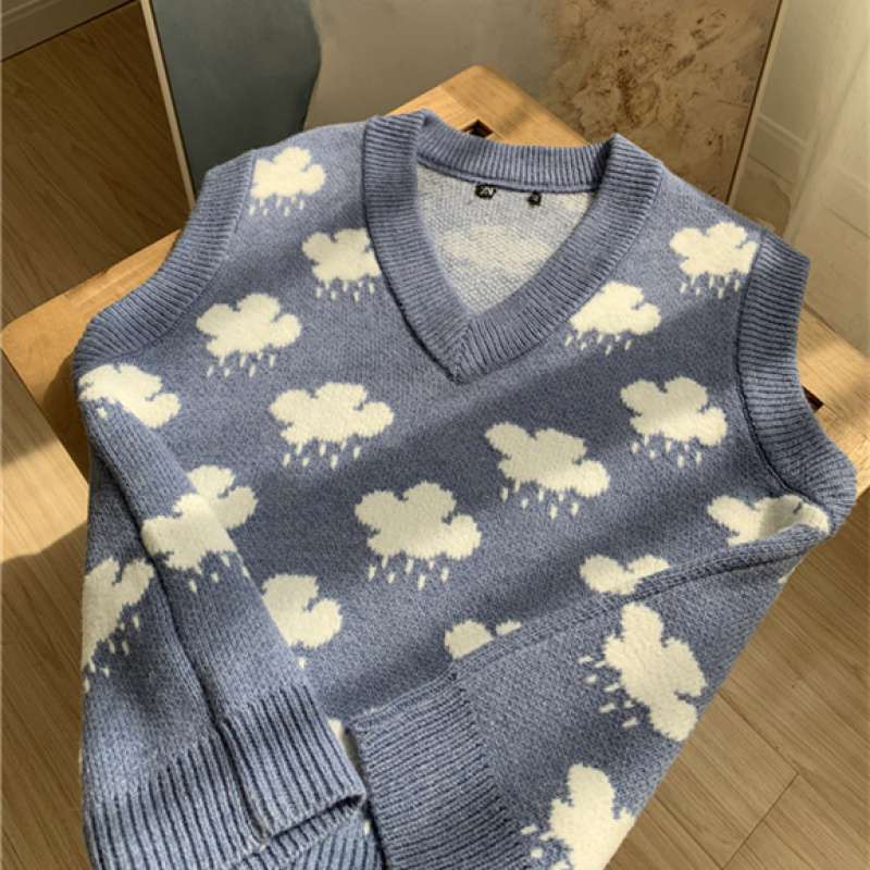 새로운 자카드 스웨터 블루 리틀 클라우드 스웨터 니트 조끼 V-넥 느슨한 조끼 여성 학생 연령 감소 느슨한