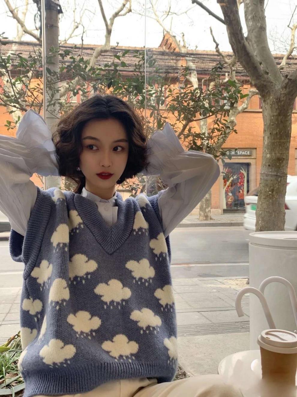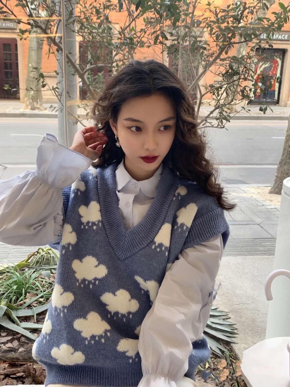 새로운 자카드 스웨터 블루 리틀 클라우드 스웨터 니트 조끼 V-넥 느슨한 조끼 여성 학생 연령 감소 느슨한스토어 가기