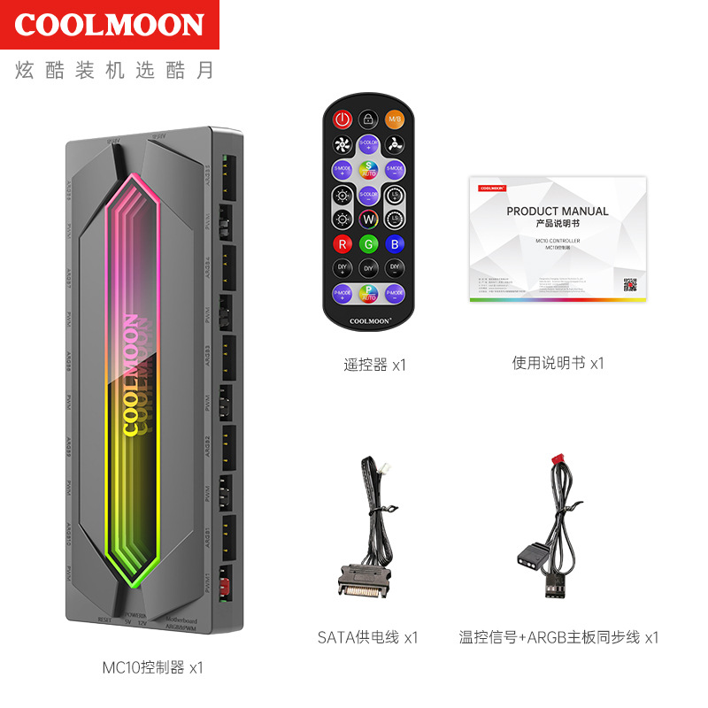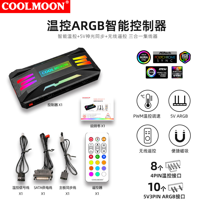 COOLMOON/酷月全新升级款四合一控制器:配置了音乐感应律动、PWM智能温控、5V ARGB神光同步、无线遥控四大核心功能,是一款性能强悍的高品质集线器。通用性标准4针温控接口和5V3针ARGB接口,兼容性强。多接口设计,强力磁吸,扩展加装更方便!【跨境热销爆款,可提供中文/英文图片包】