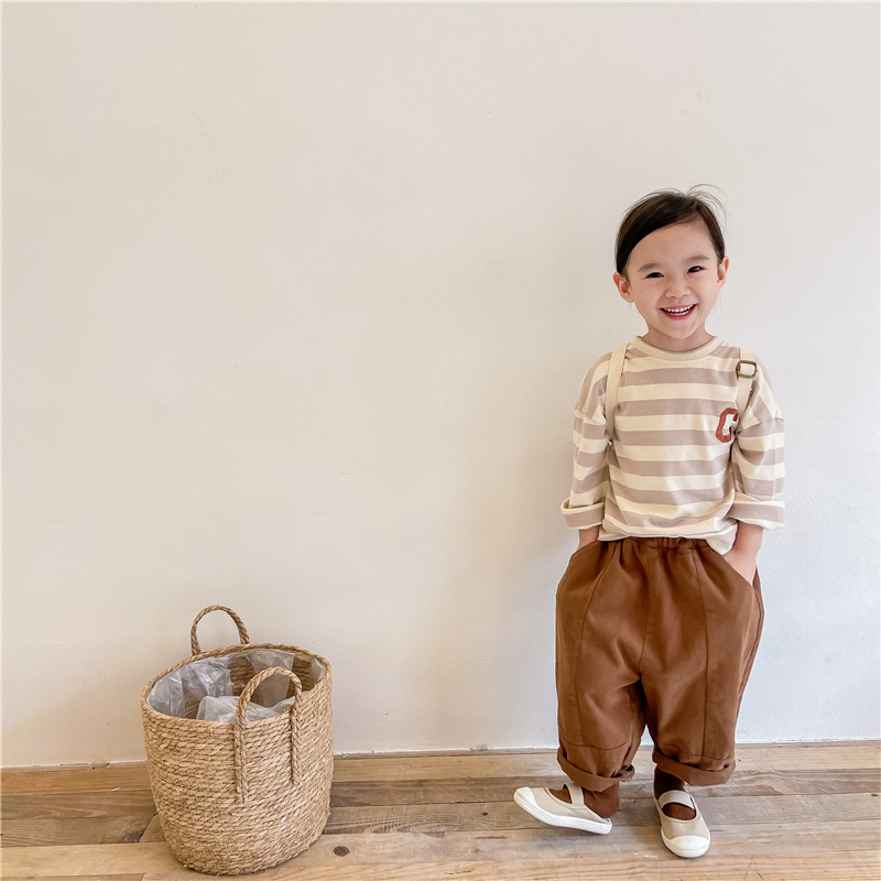 어린이 줄무늬 긴팔 티셔츠 2024 가을 소년과 소녀 한국 둥근 목 편지 자수 루즈 탑스토어 가기