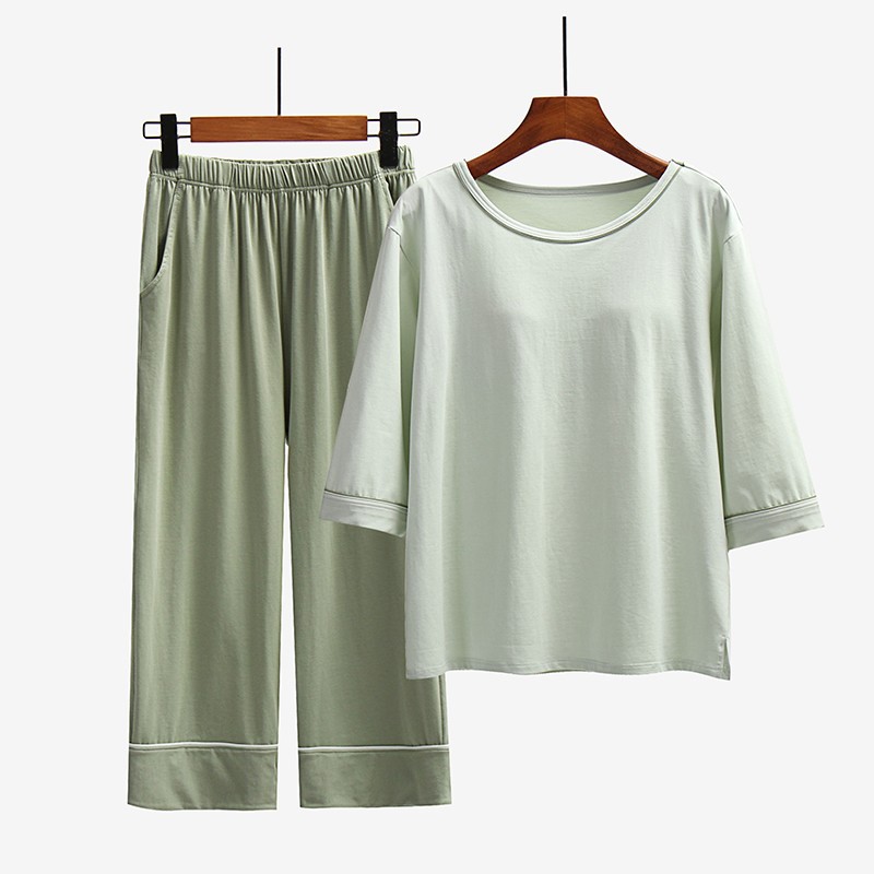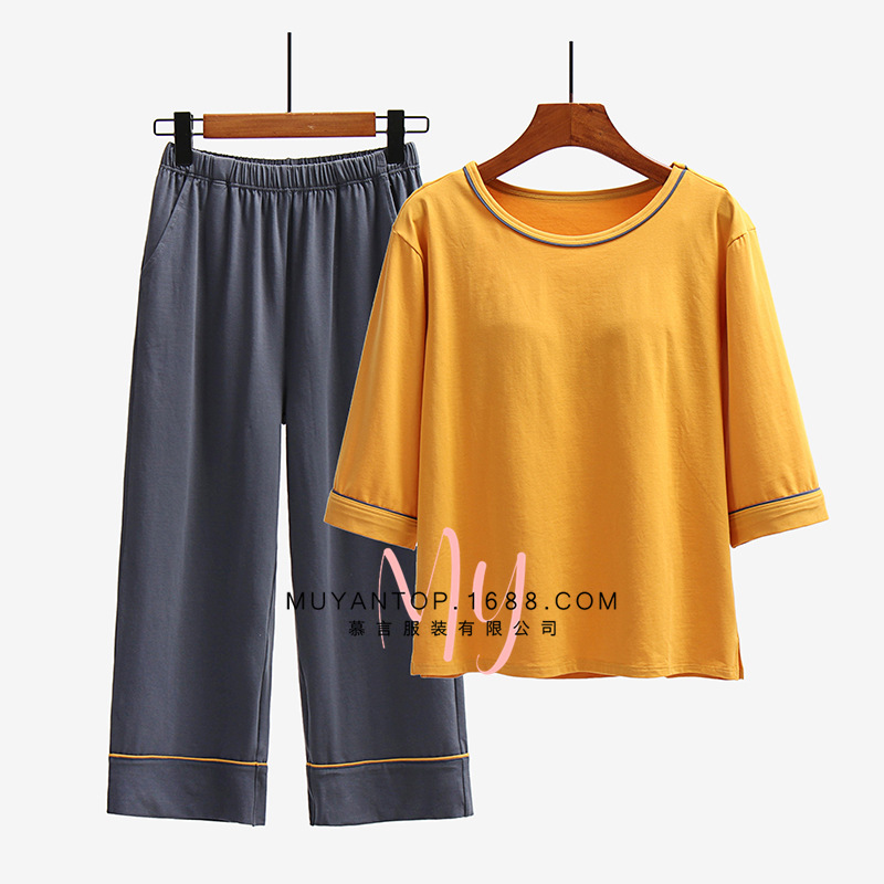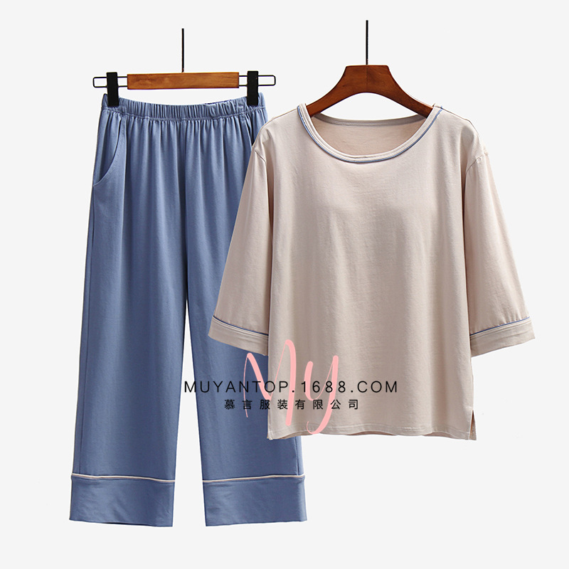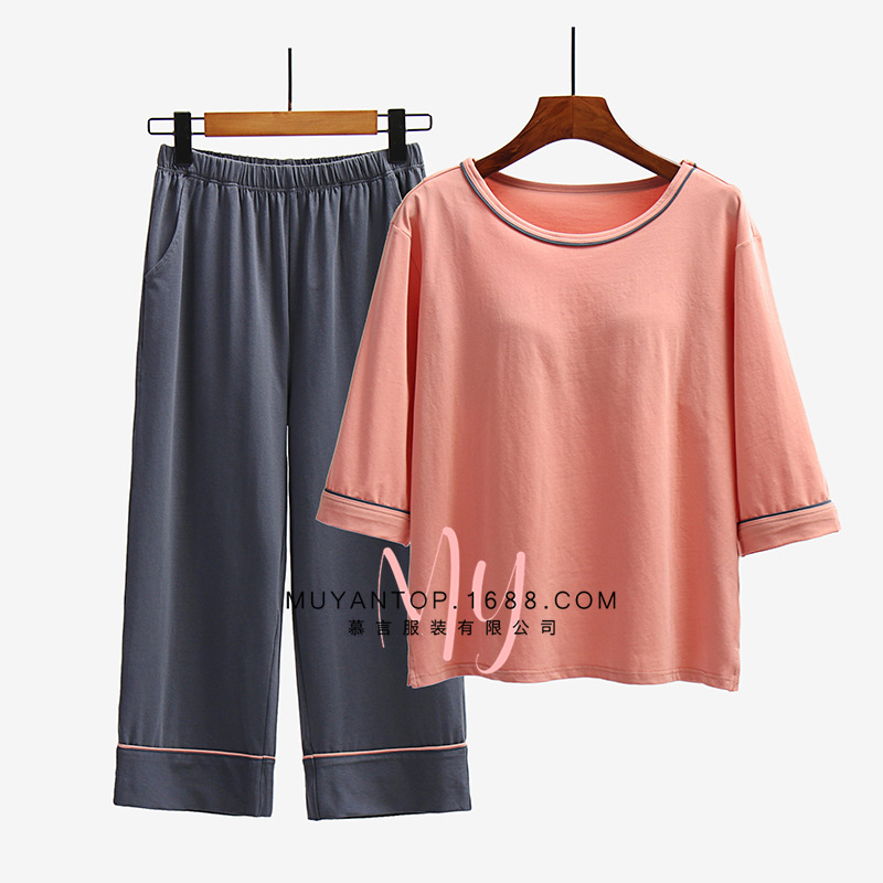 가슴 패드가있는 여성 잠옷 7 점 슬리브 세트 여름 느슨한 잠옷 한국식 순면 가정복 착용 프리 브라 투피스 팩스토어 가기