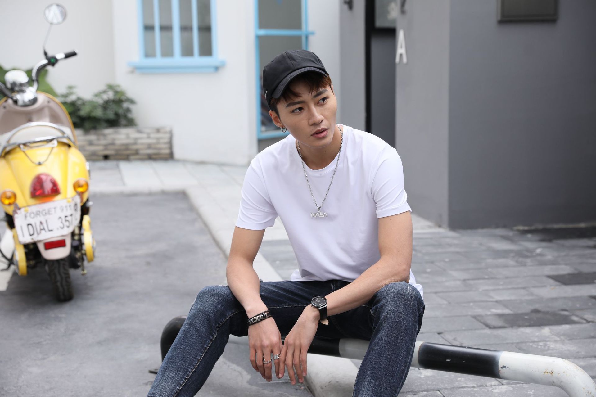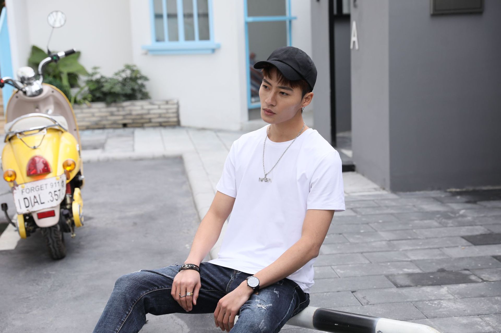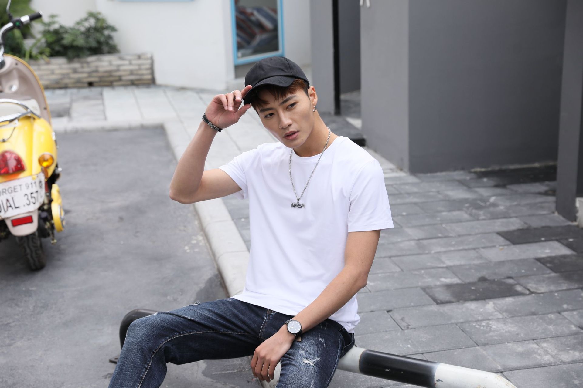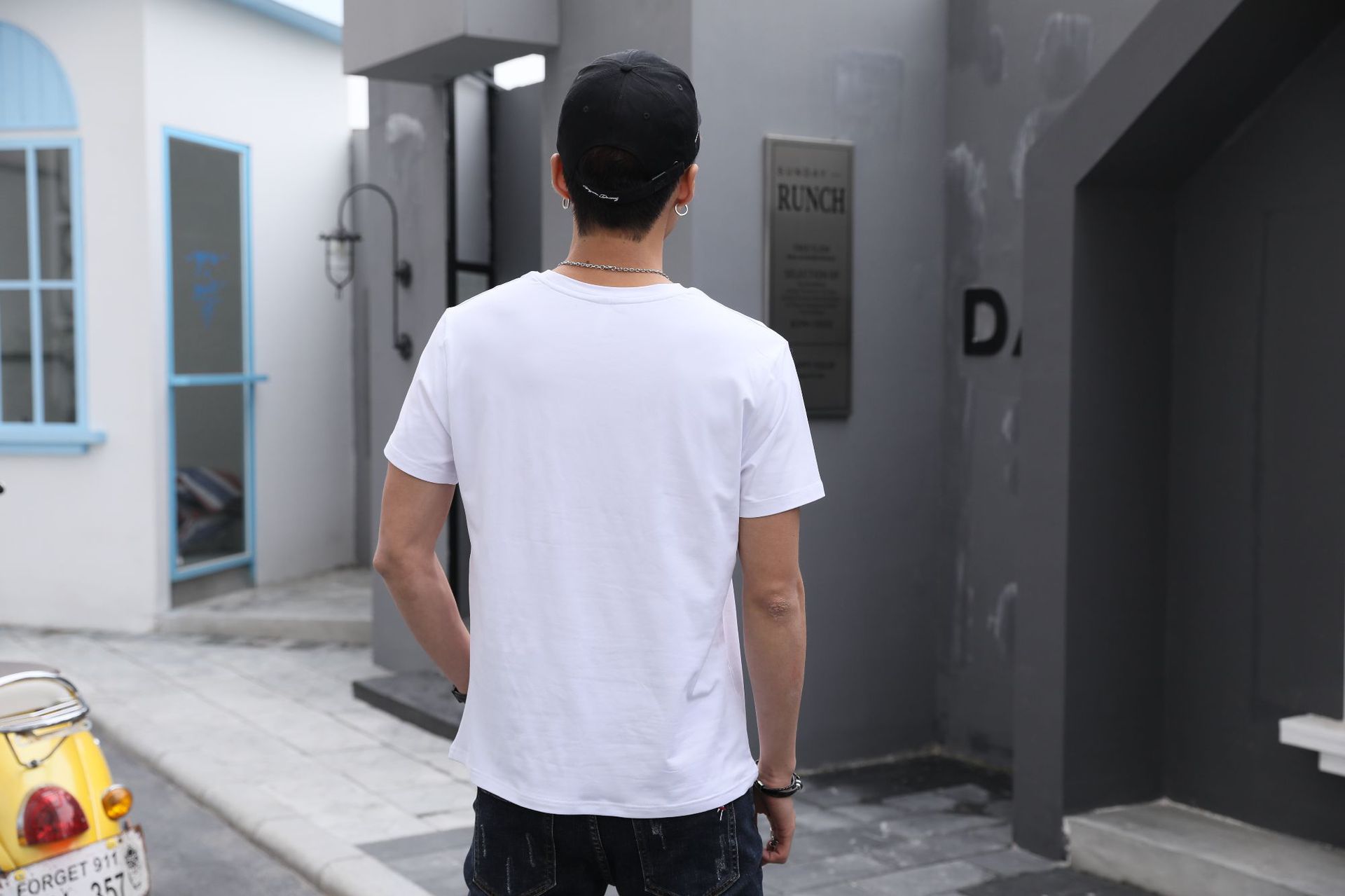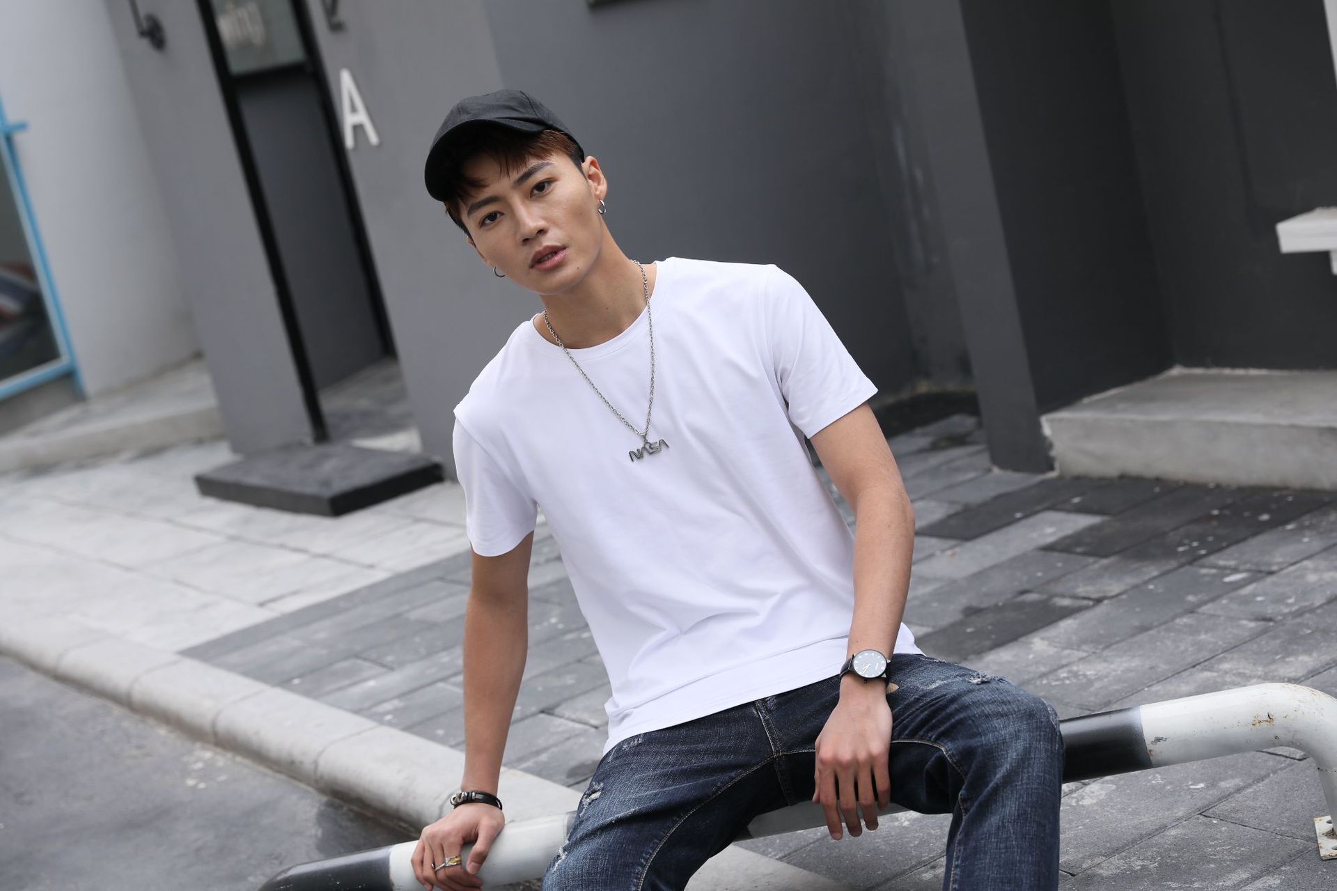 모달 원단의 어깨 부분에 프린트된 로고가 있는 반팔 라운드넥 남성 티셔츠, 캐주얼하고 다용도로 활용 가능합니다.