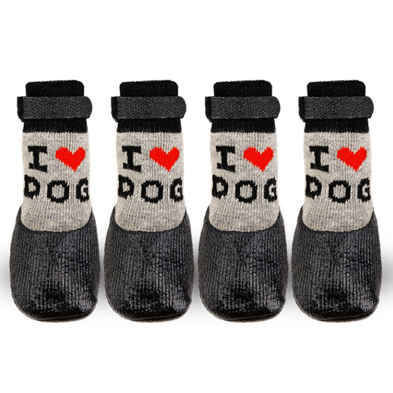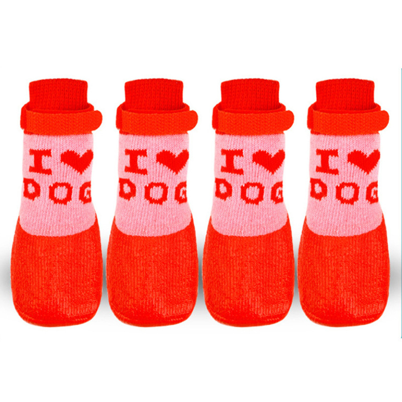 새로운 크로스 보더 개 신발 LOVE 개 신발 울 니트 부드러운 실리콘 바닥 개 실내 미끄럼 방지 부츠 애완 동물 신발 및 양말스토어 가기