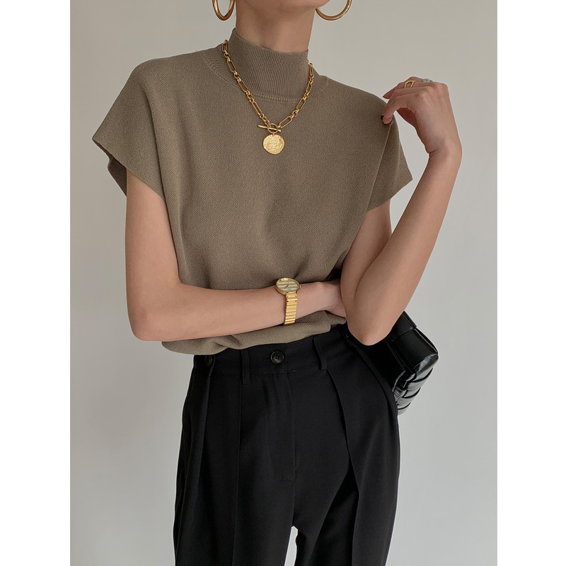 프렌치 슬림 룩 하프 하이 칼라 휘슬 니트 조끼 여성용 티셔츠 루즈한 2023 새로운 짧은 소매 탑 여름