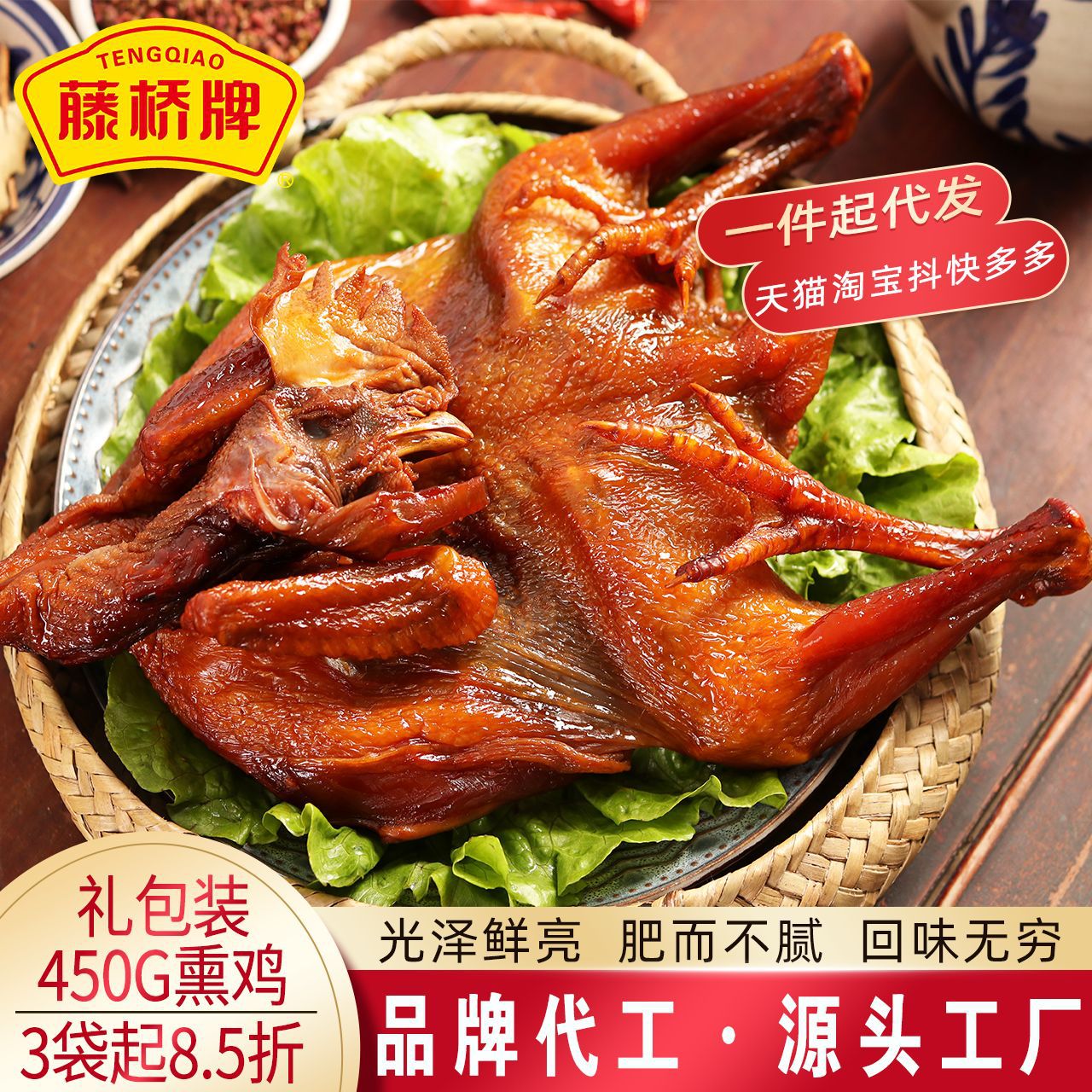 텅차오 브랜드 훈제 닭고기, 원저우 특산품 선물 간식, 즉석 조리 가능 450g 닭고기 간식 도매 제조업체