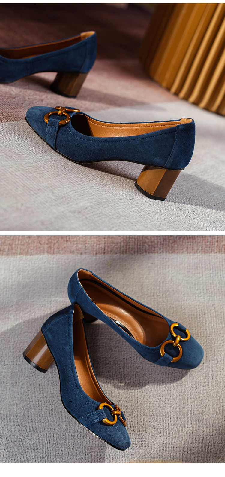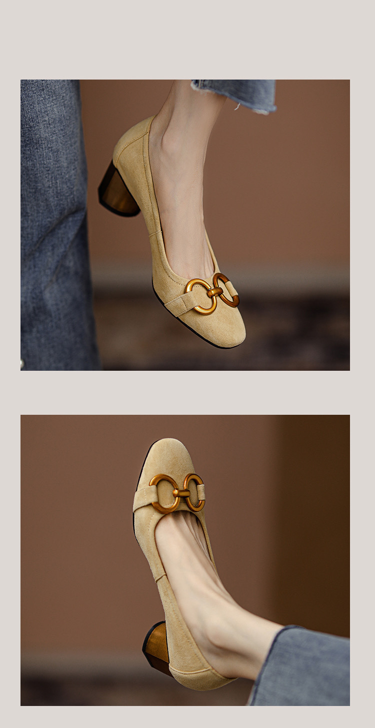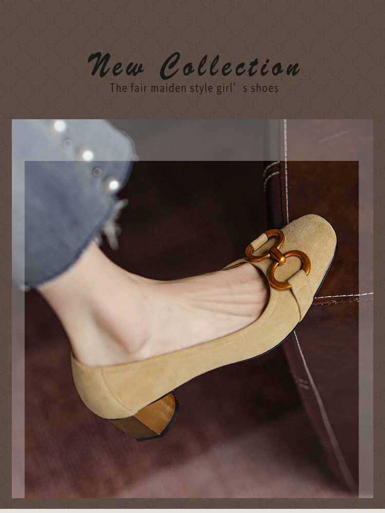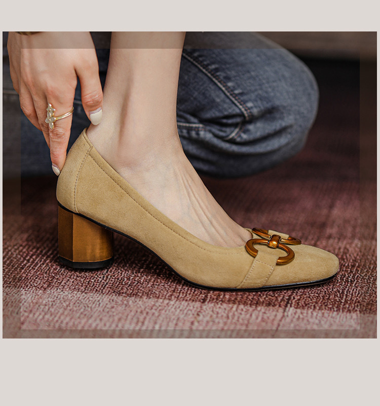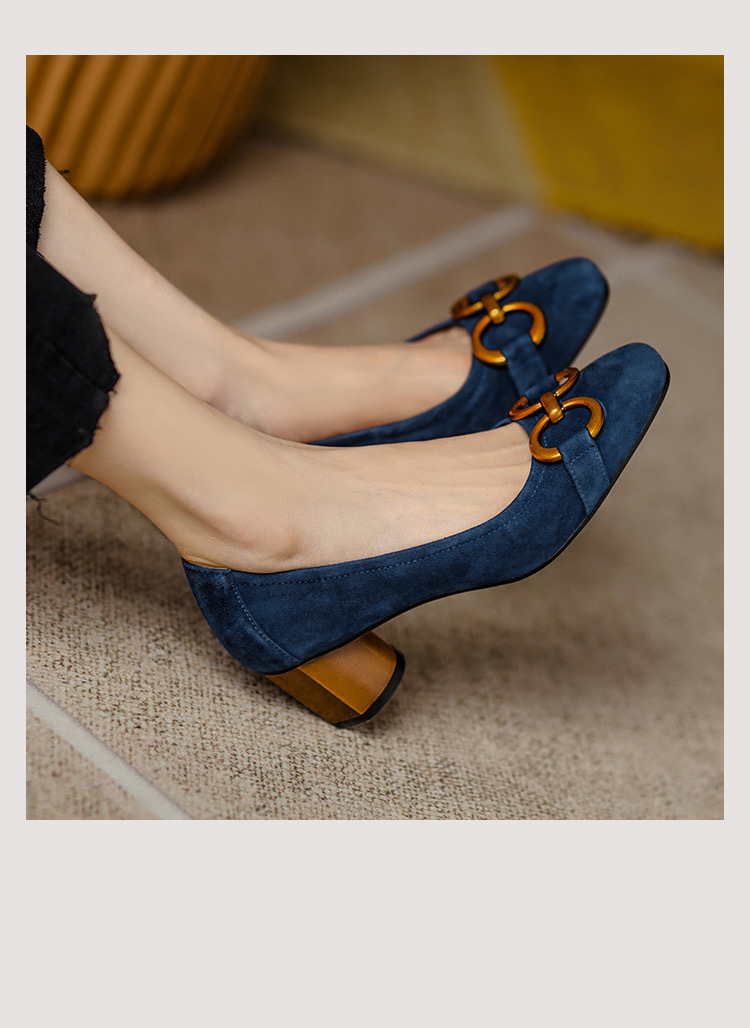 蓝色方头浅口单鞋女2021年新款春款女鞋法式高跟鞋女磨砂金属粗跟