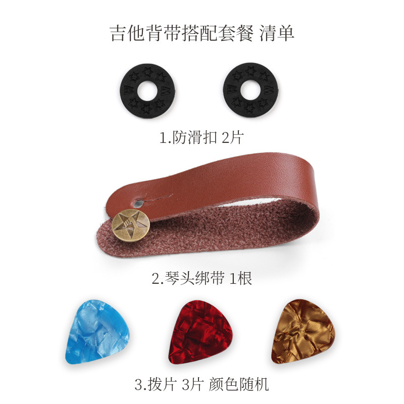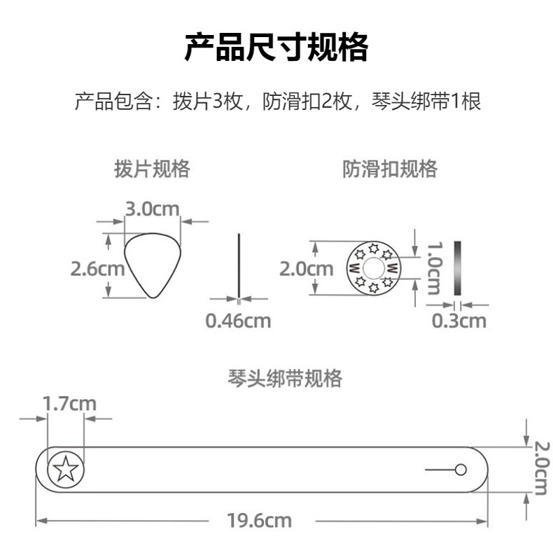 本品包含:琴头绑带1根,背带防滑扣2片, 拨片3片。为套餐优惠价格。