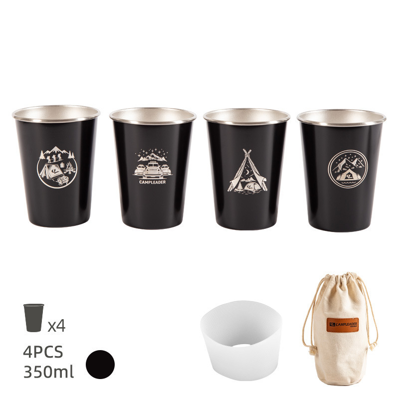 • 블랙-스텐 컵 4 개 세트 350ml (수납 봉투 + 실리콘 컵 세트)