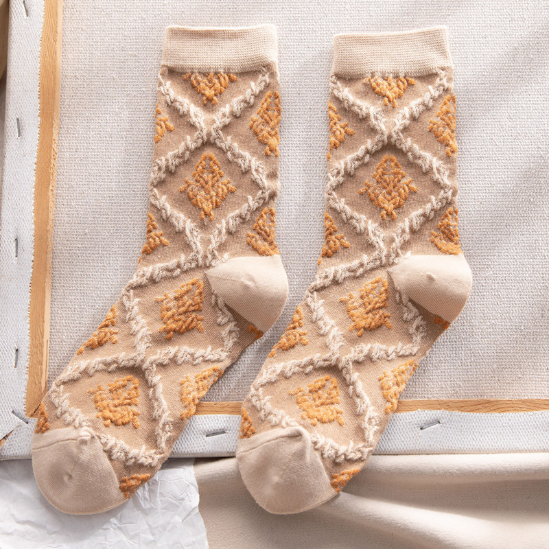 새로운 가을과 겨울 양말 여성 자수 유행 양말 빈티지 중간 길이 양말 양각 입체 패턴 캐주얼 양말 중국 스타일 양말