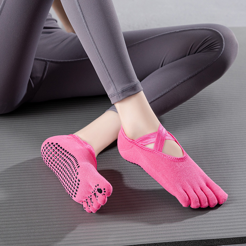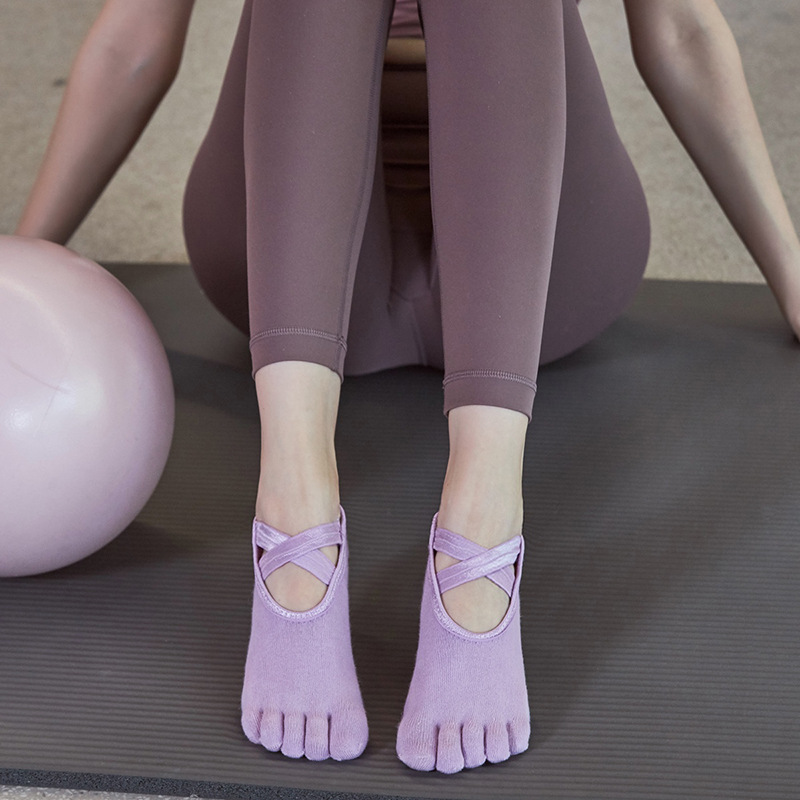 2021 새로운 요가 양말 크로스 스트랩 5 손가락 미끄럼 방지 레이스 업 댄스 스플릿 토 필라테스 양말 도매스토어 가기