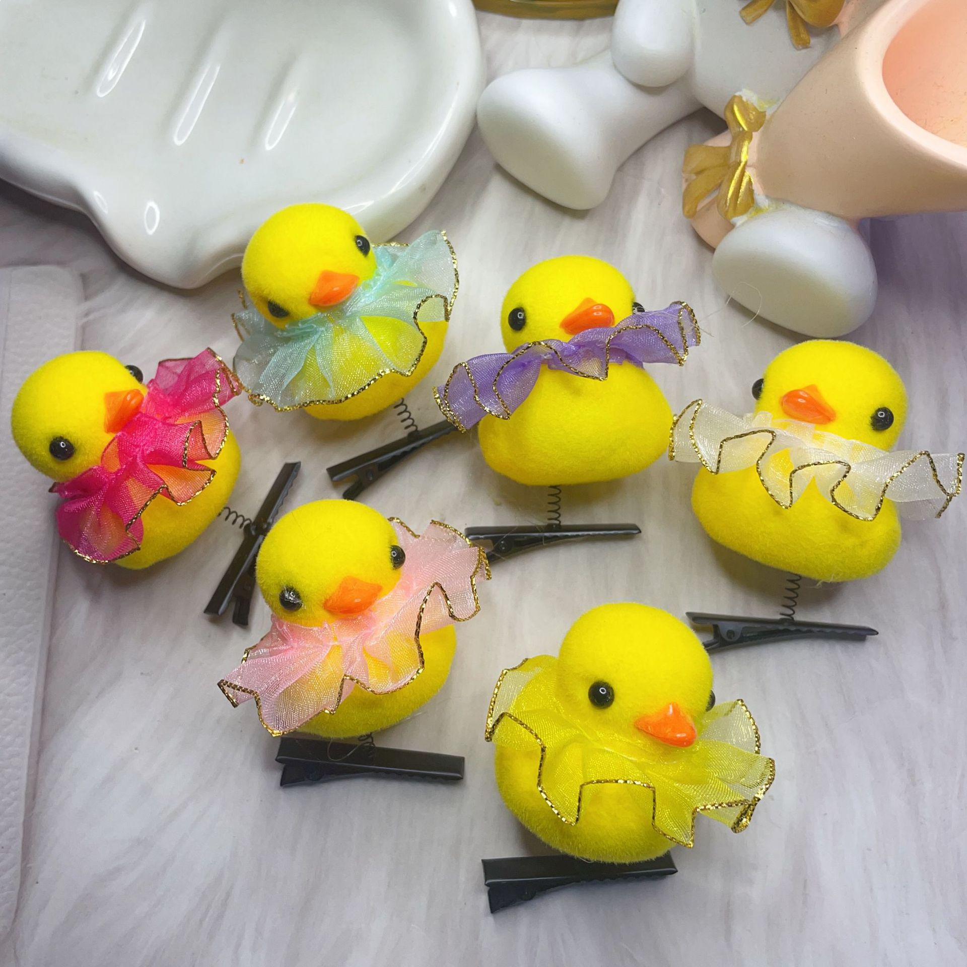 • 밝은 실크 헤어 볼 노란색 오리 머리핀