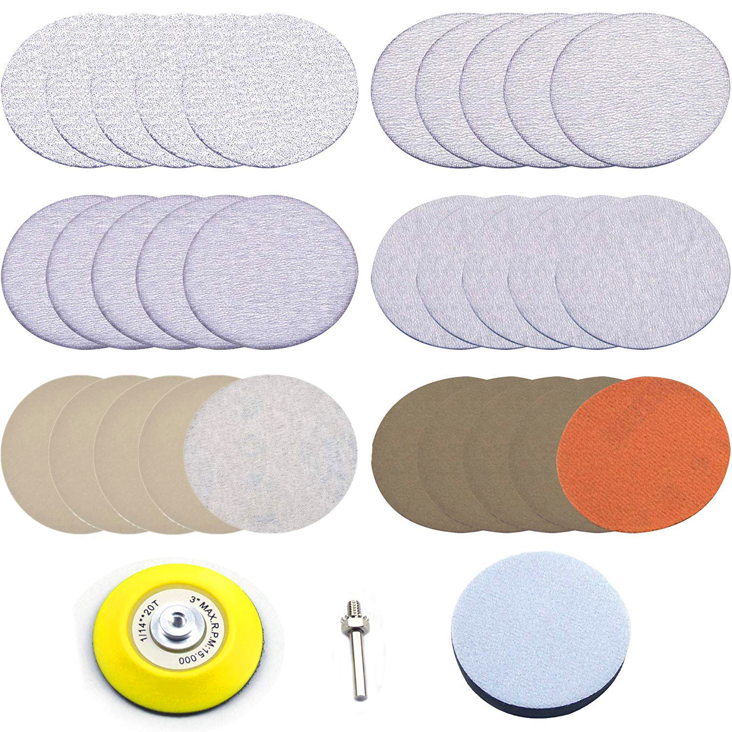 组合二:3 英寸 60、240、600、1000、5000 和 10000 粒度各 5 件 + 1 件 1/4 英寸柄钻附件 + 1 件 3 英寸备用打磨垫 + 1 件 3 英寸软接口垫