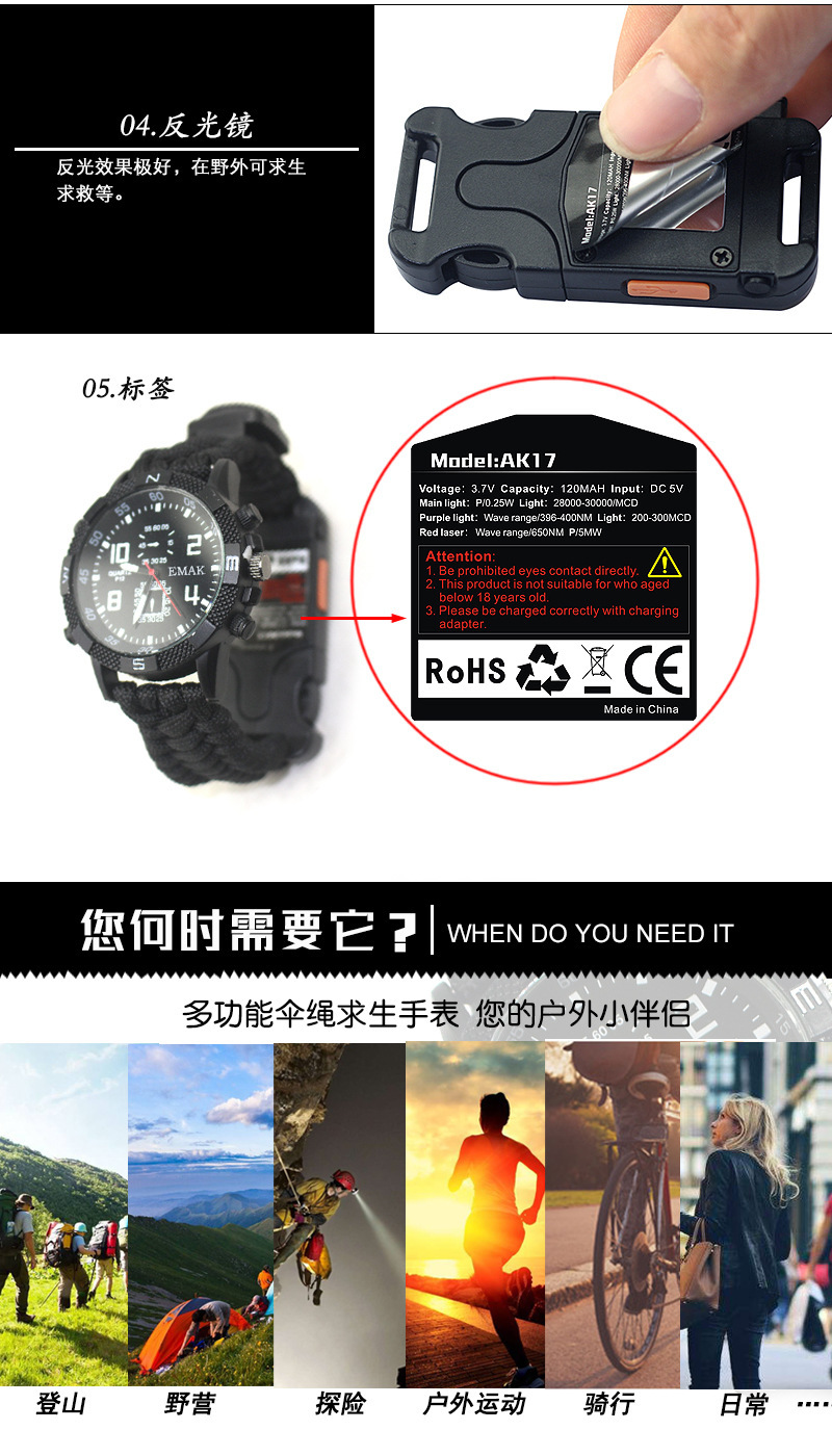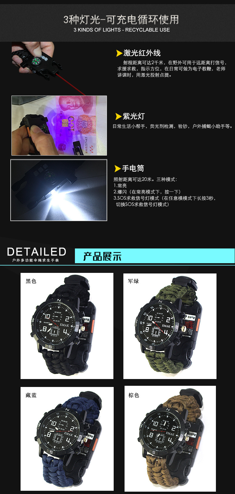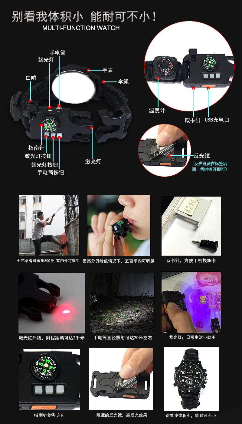 功能:1 手电筒,2 红外激光灯,3 紫光灯,4 求生哨,5 取卡针,6 放大镜,7 指南针温度计,9伞绳,10时间。