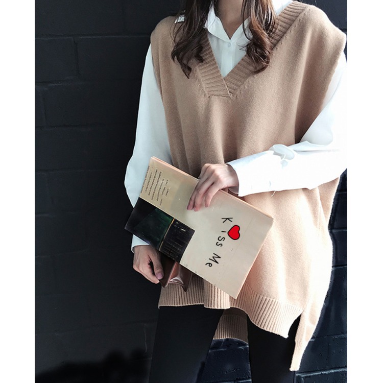 V-넥 스웨터 조끼 여성용 한국식 민소매 니트 조끼 심플한 대학 스타일의 루즈한 겉옷 착용 세련된 조끼