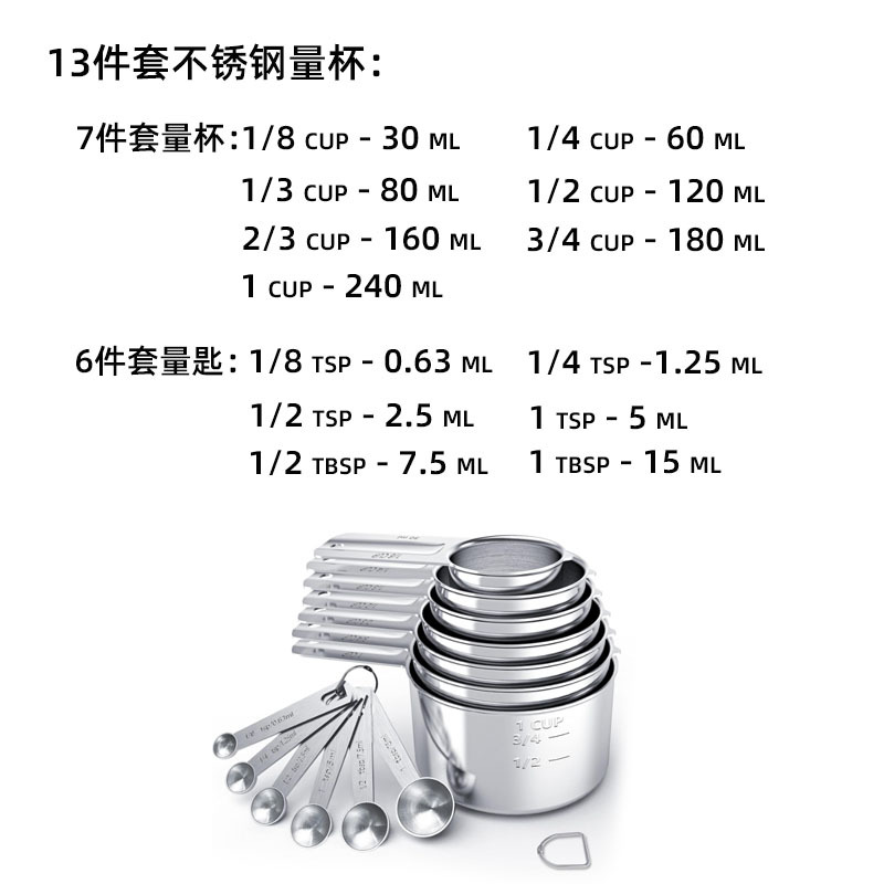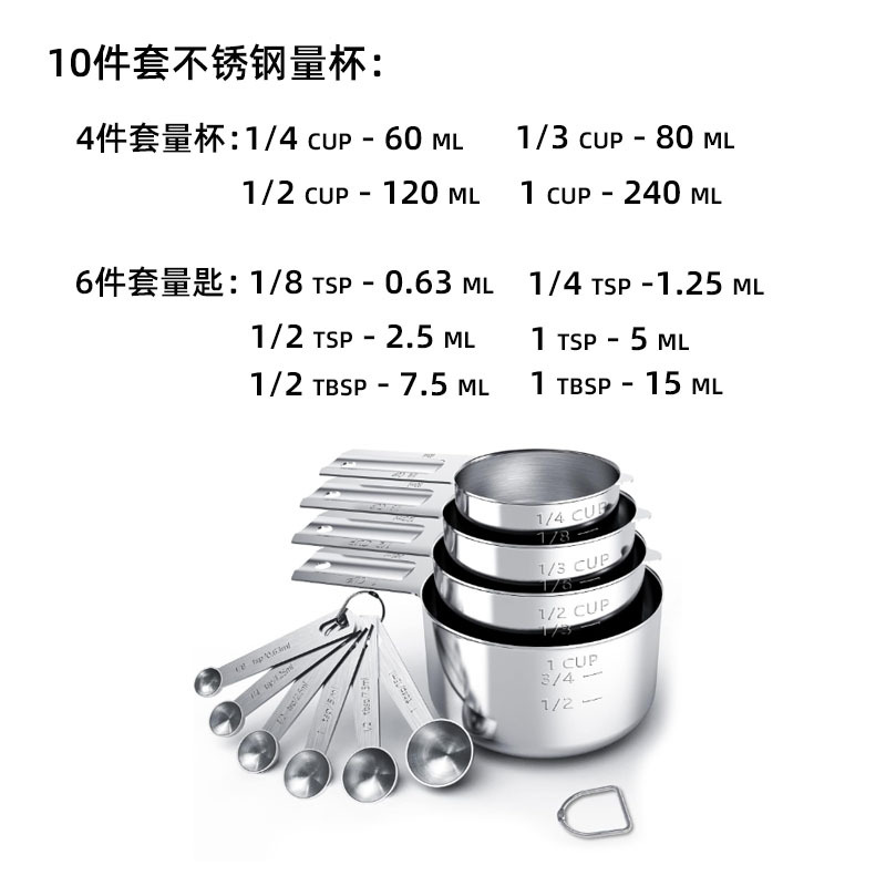 产品材质:304不锈钢量杯+430不锈钢量匙