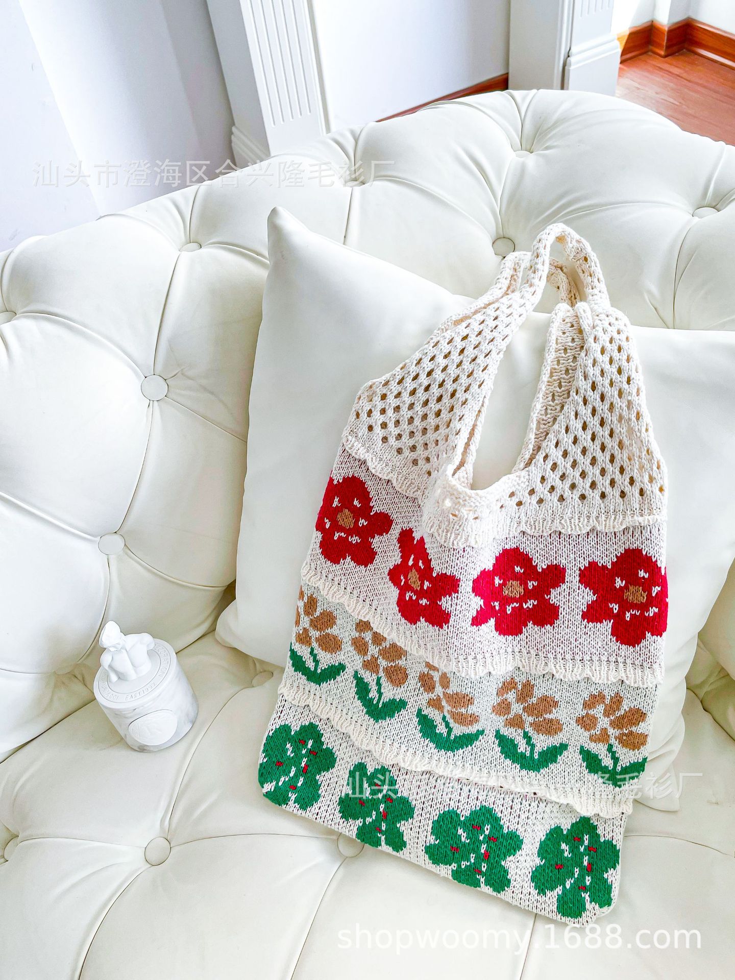 亚马逊ebay手工编织简约复古镂空针织手提单肩包花朵包百搭沙滩包
