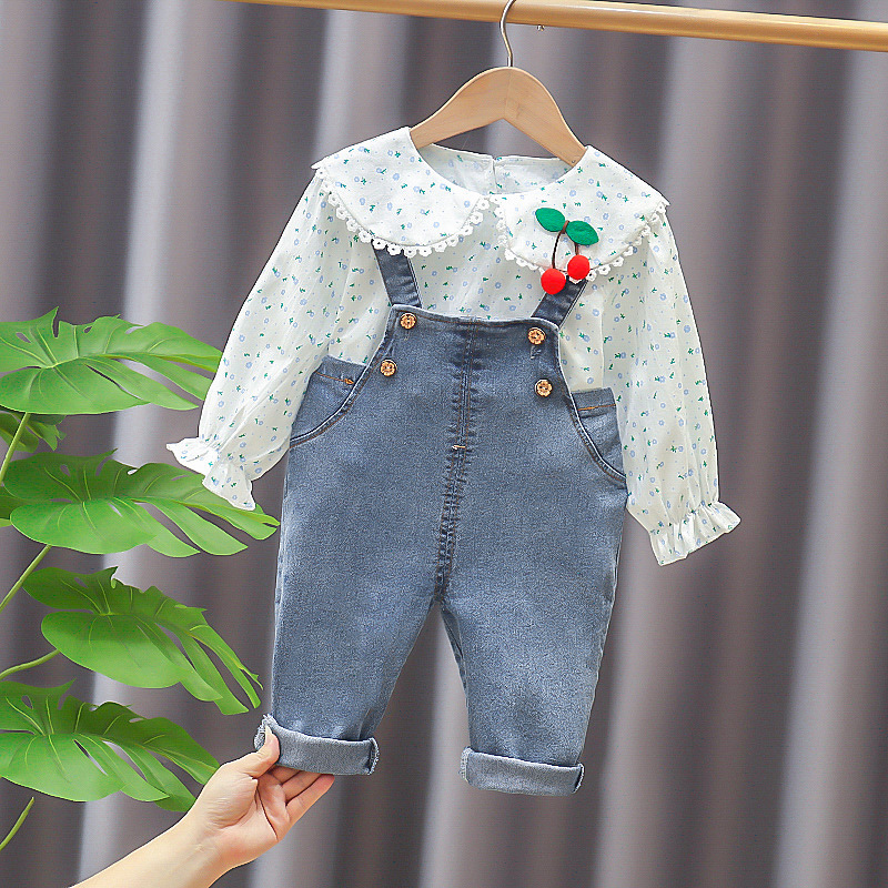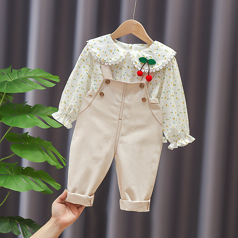 2021 가을 새로운 소녀 체리 긴 소매 스트랩 세트 소녀 아기 외국 스타일 가을 세트 머리카락의 세대