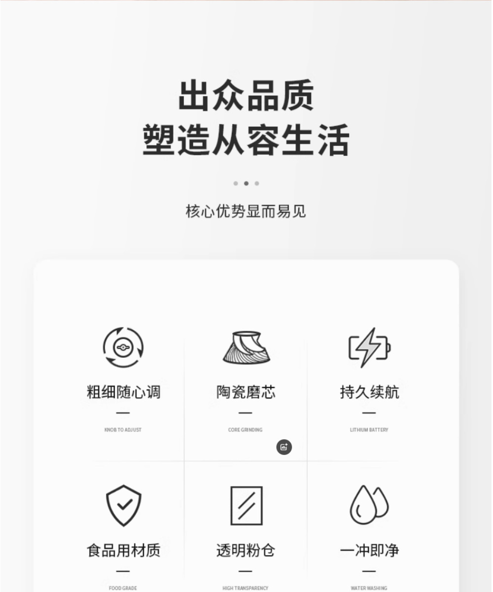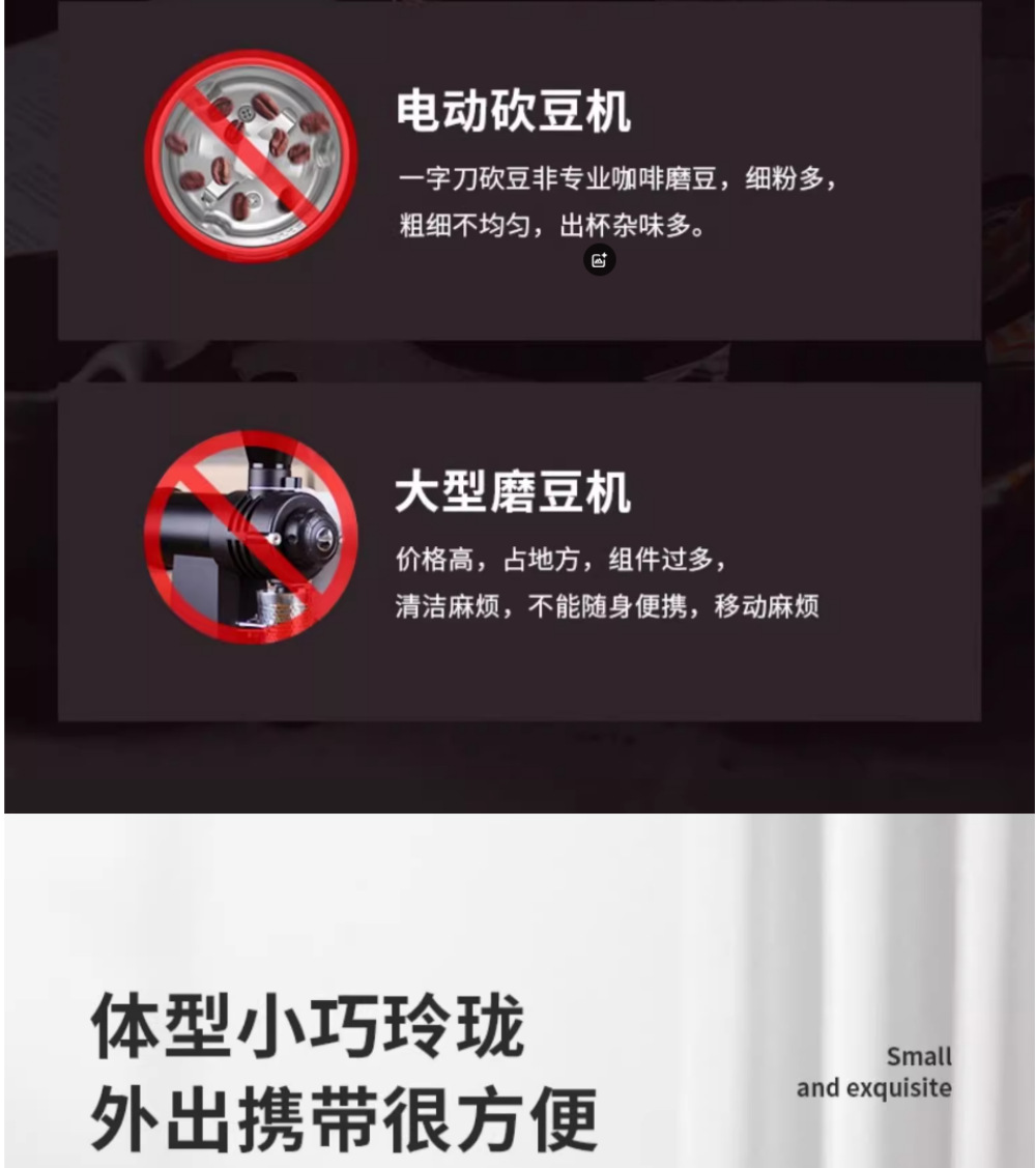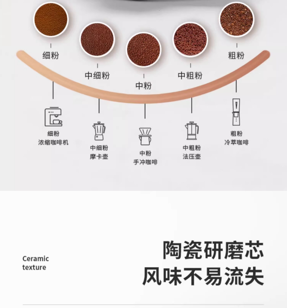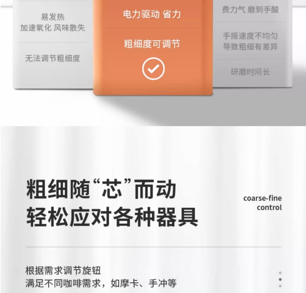 1.无极调粗细,最细能研磨30目的咖啡粉(>90%).