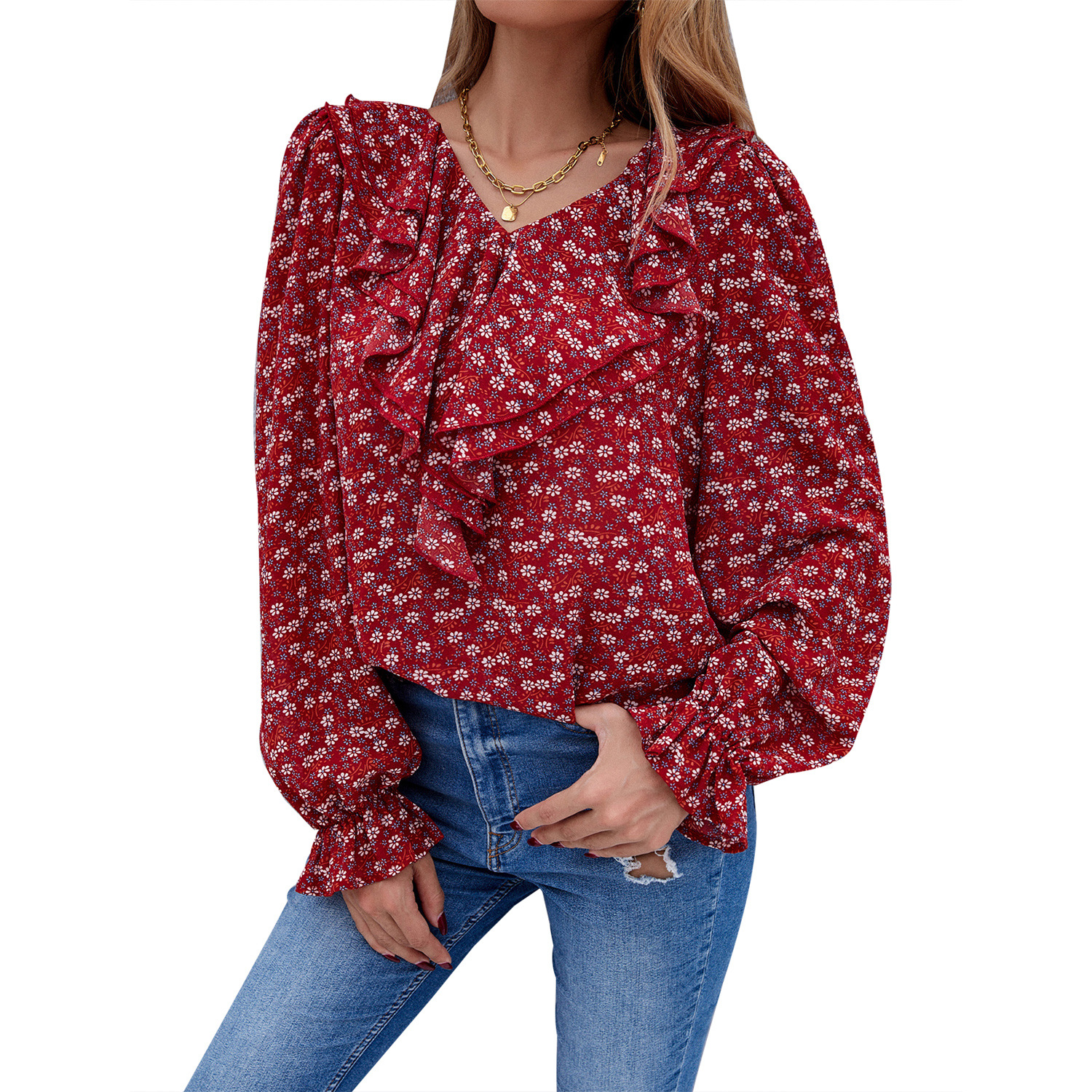 90821 # 아마존 유럽과 미국 크로스 보더 기질 셔츠 여성용 꽃 V-넥 트럼펫 슬리브 느슨한 쉬폰 셔츠 조수스토어 가기