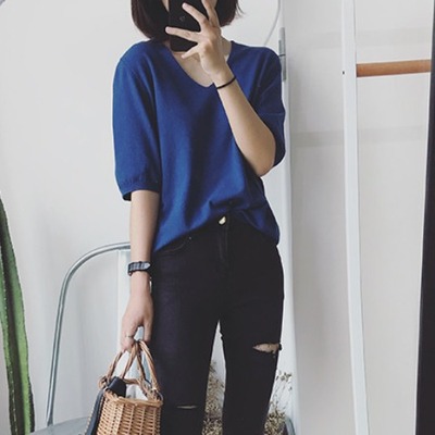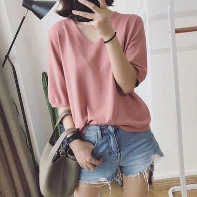 여성 여름 새로운 한국 스타일 간단한 v 넥 다목적 루즈 풀오버 티셔츠 솔리드 컬러 미드 슬리브 바닥 셔츠스토어 가기