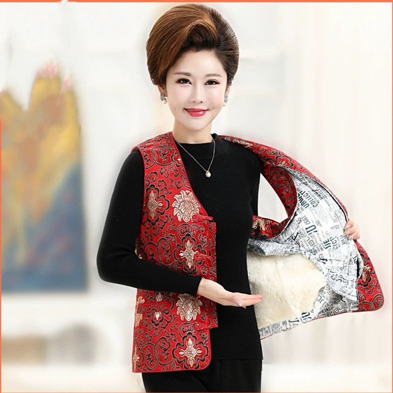 • 여성용 레드 하의 대형 플라워 양피 조끼 [탈착 라이너]]