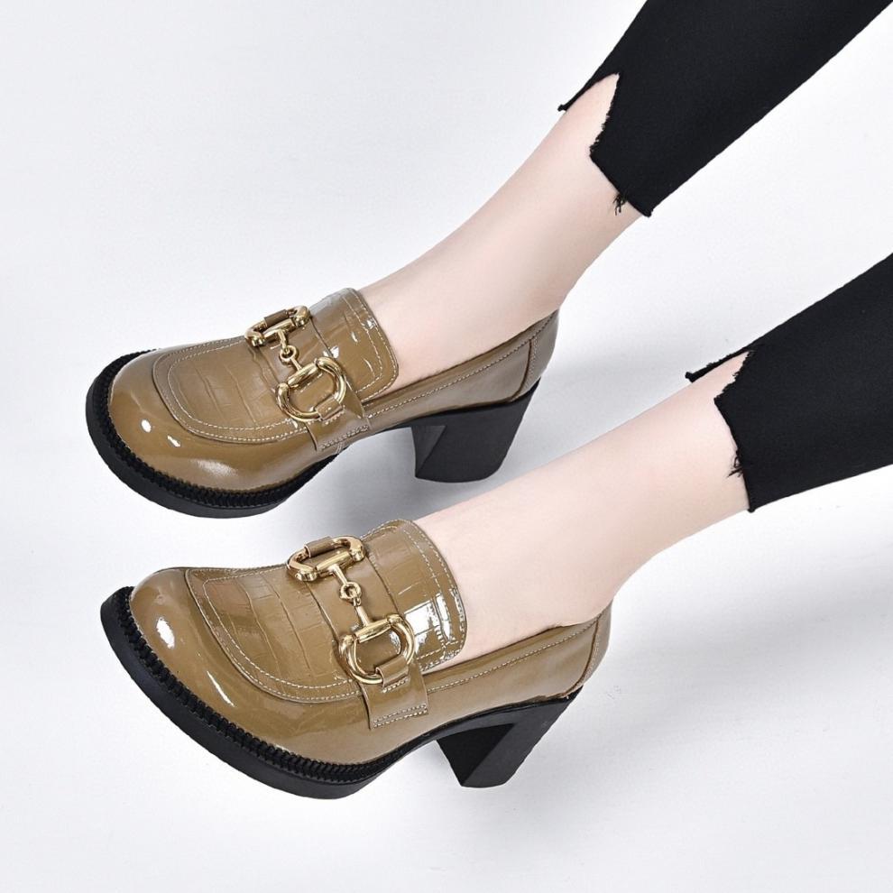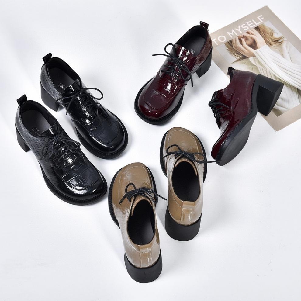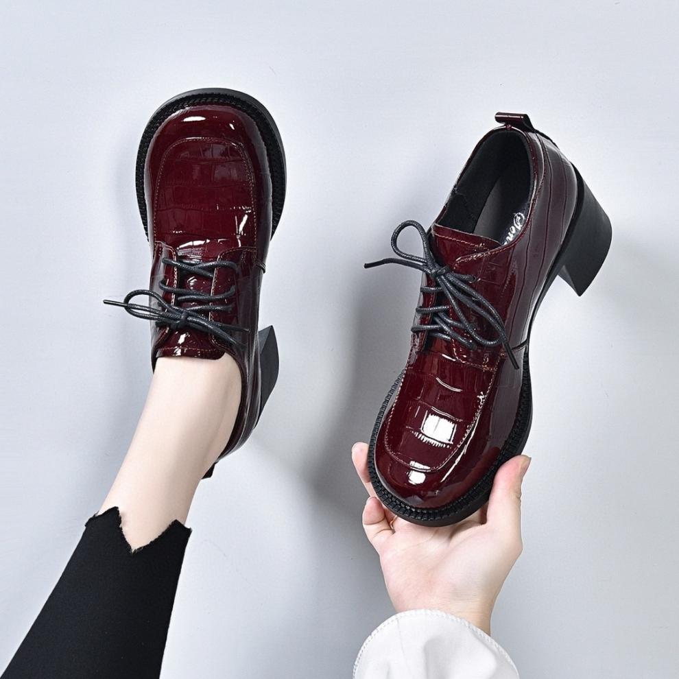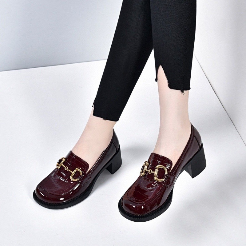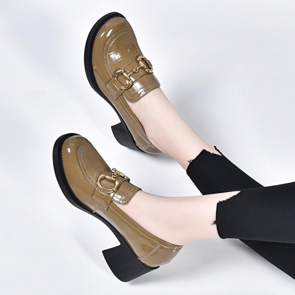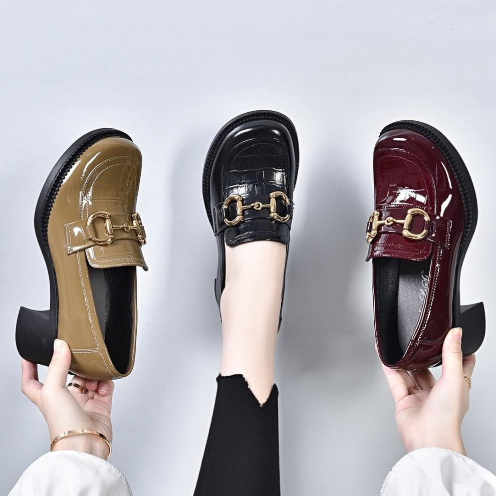 영국 스타일 큰 머리 작은 가죽 신발 여성용 두꺼운 굽 가죽 단층 신발 2023 봄과 가을 여성용 새로운 에나멜 가죽 슬립온 로퍼
