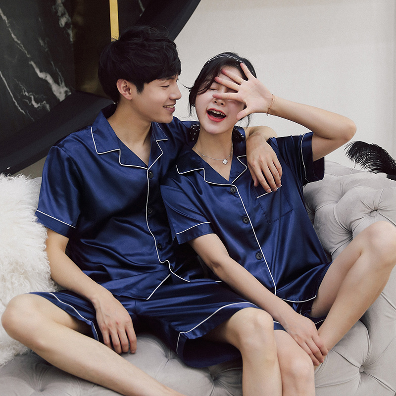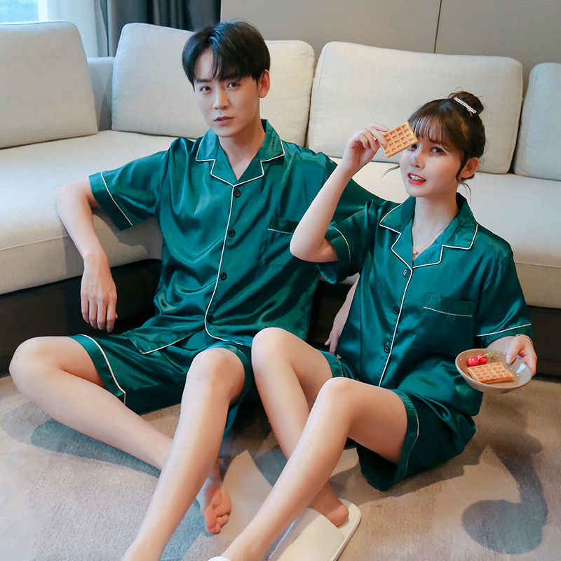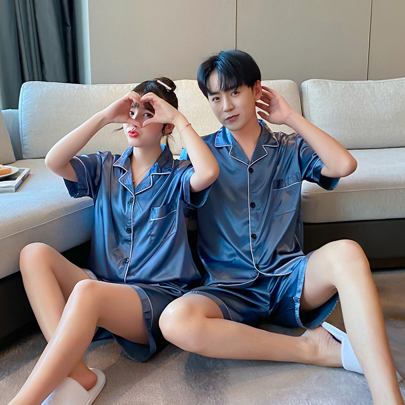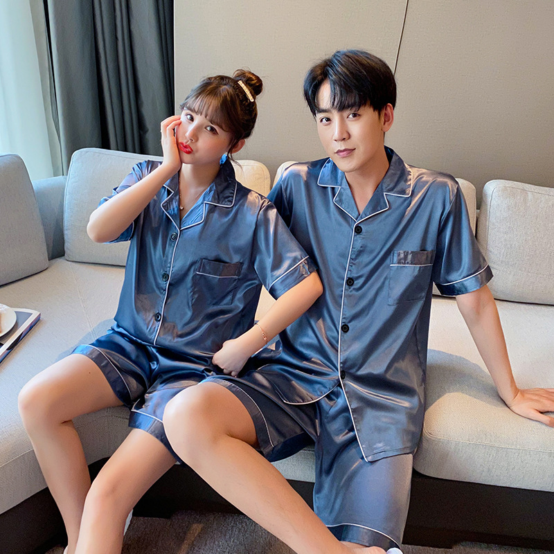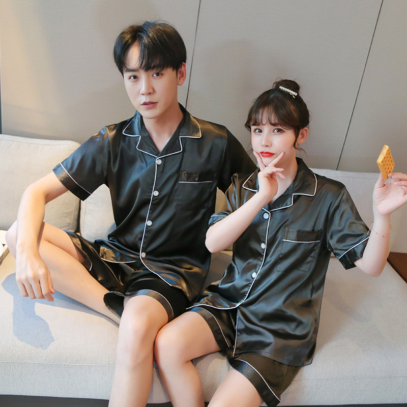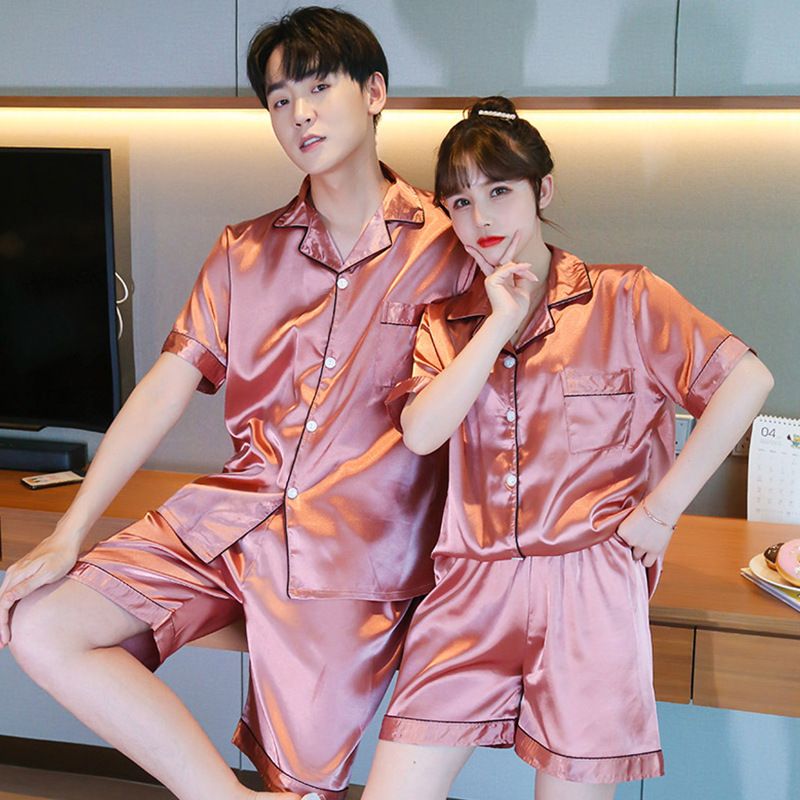여성용 아이스 실크 잠옷 여름 반팔 v 넥 실크 고급 커플 세트 플러스 사이즈 캐주얼 심플 남성 홈웨어