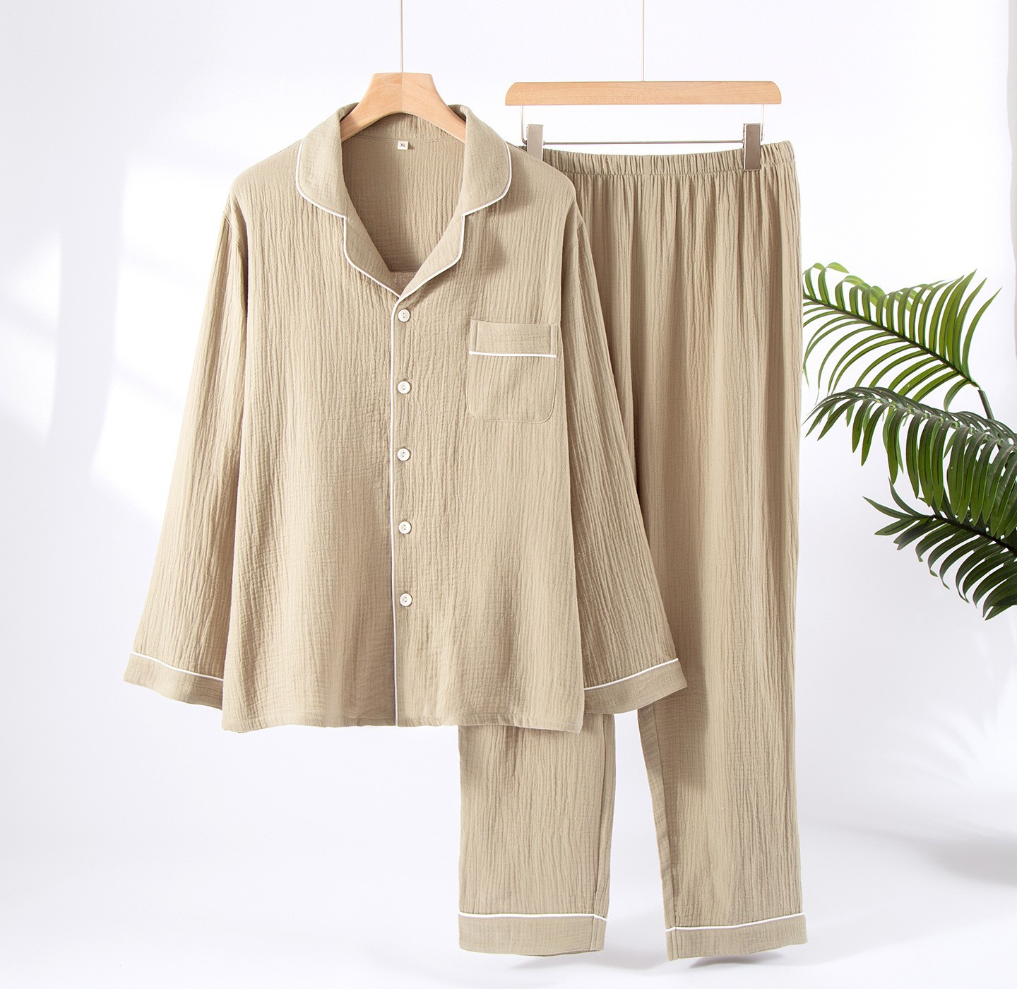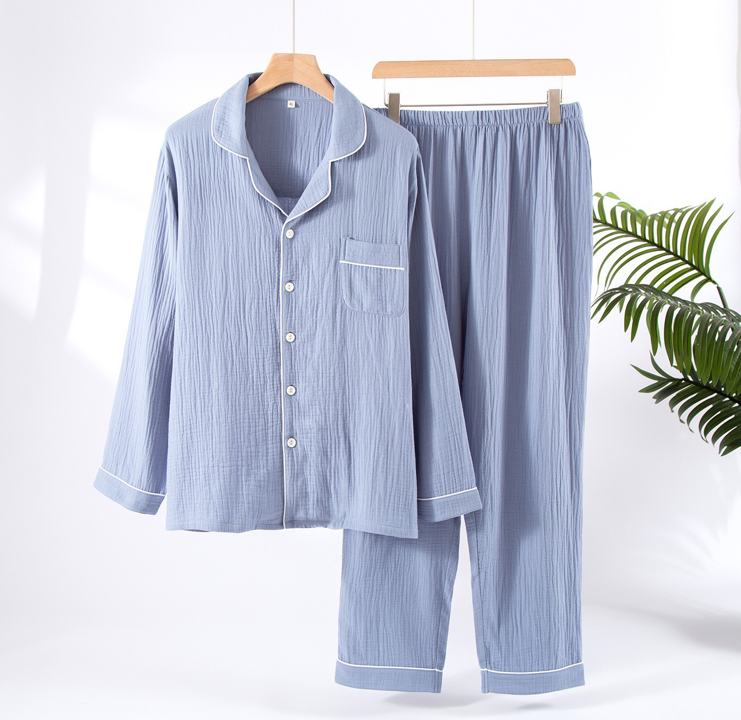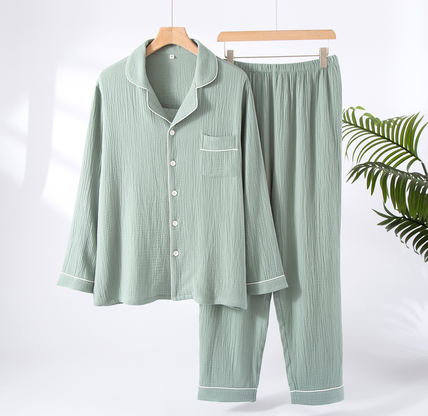 공장 직공급 면 남성 잠옷 세트 느슨한 봄과 가을 더블 거즈 플러스 사이즈 면 크레이프 긴 소매 도매
