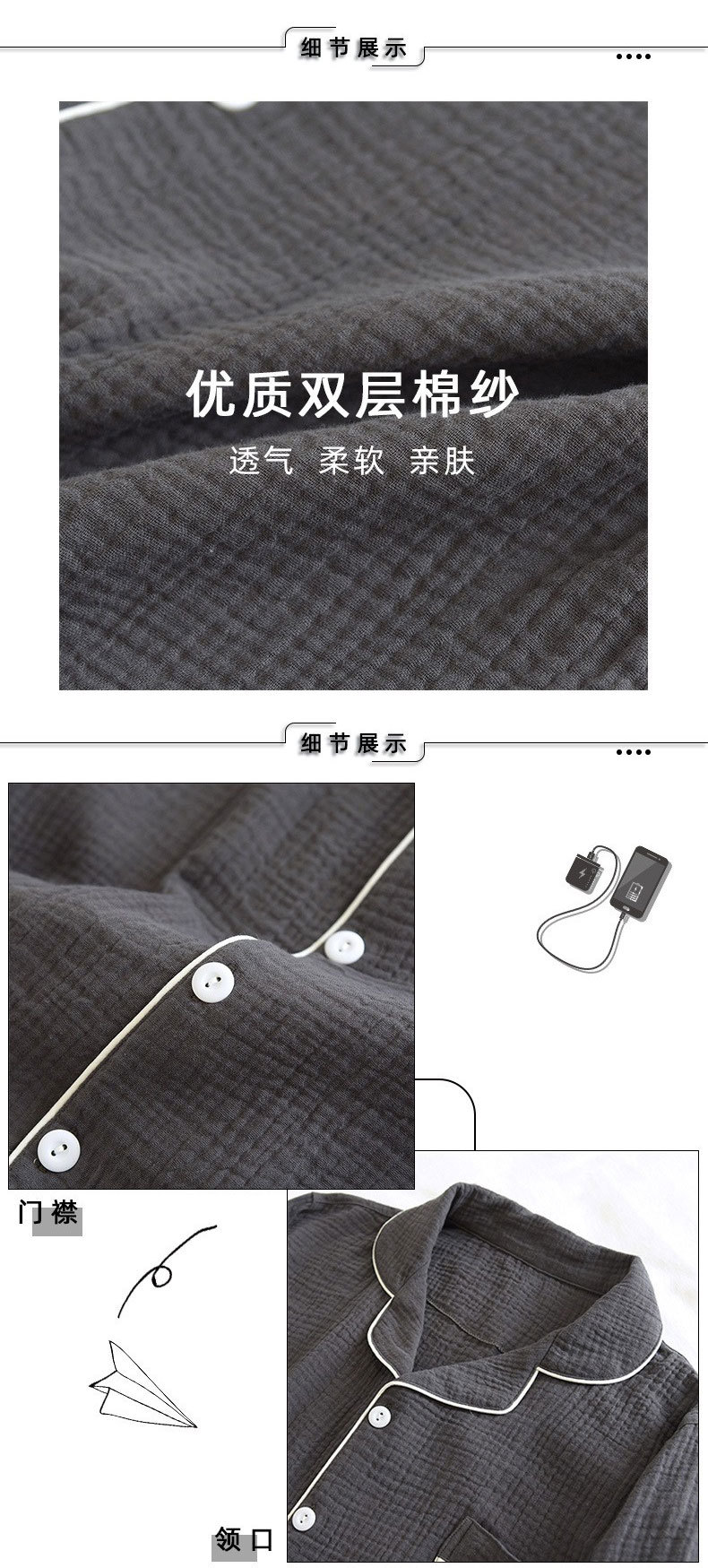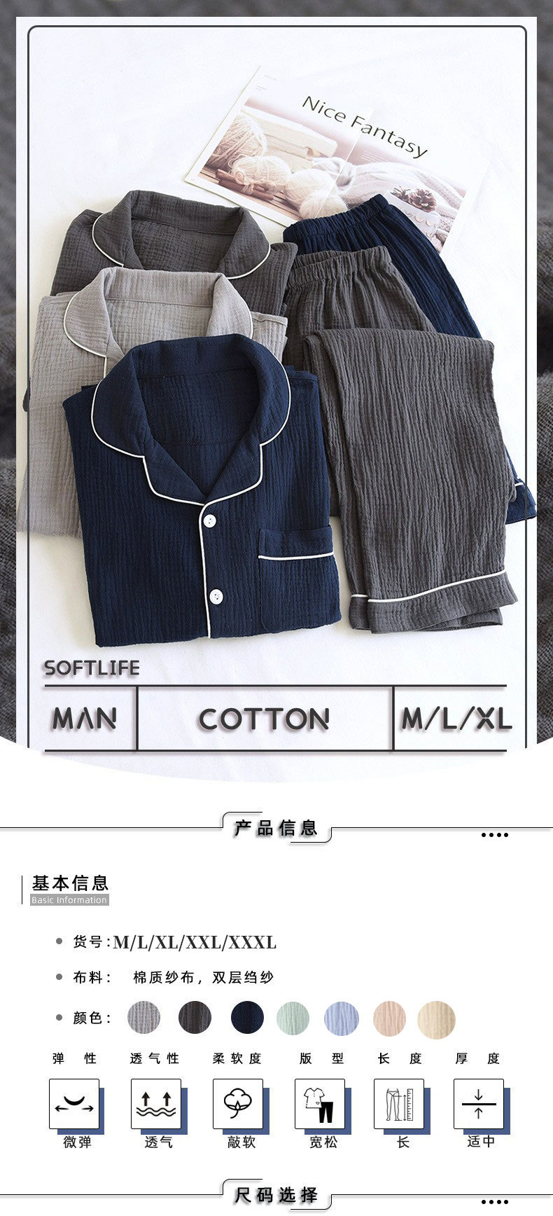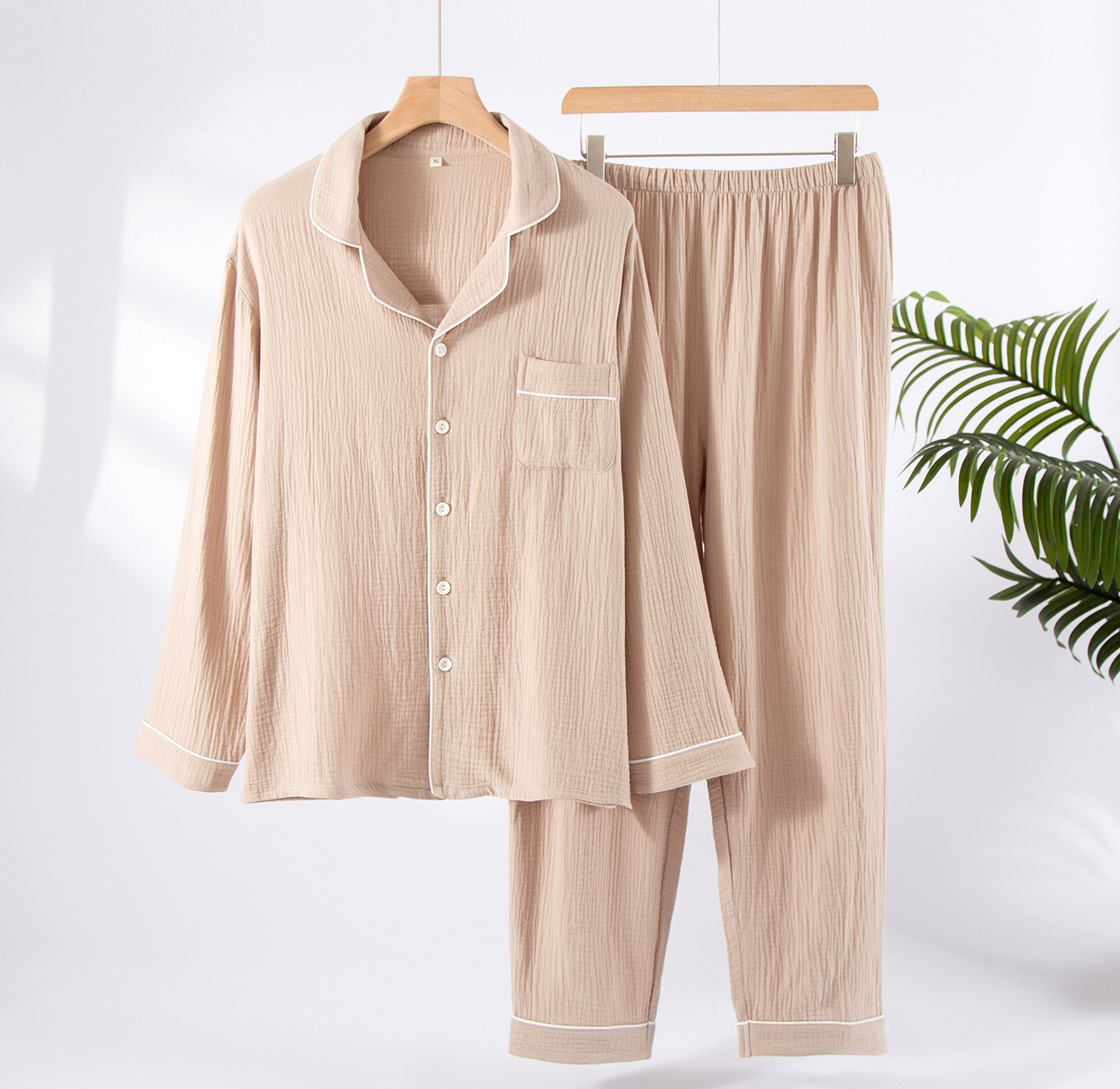 공장 직공급 면 남성 잠옷 세트 느슨한 봄과 가을 더블 거즈 플러스 사이즈 면 크레이프 긴 소매 도매