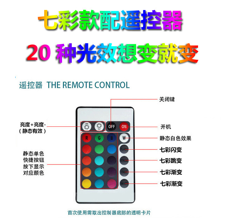 七彩RGB遥控说明七彩主要由红绿蓝三色组成的  因为要变色,芯片每次发光只有三分之一,所以七彩的会比单色的亮度要弱,是单色的三分之一,例如30W七彩的亮度相当10W单色的亮度