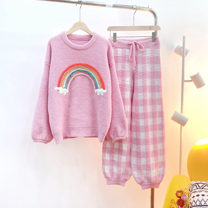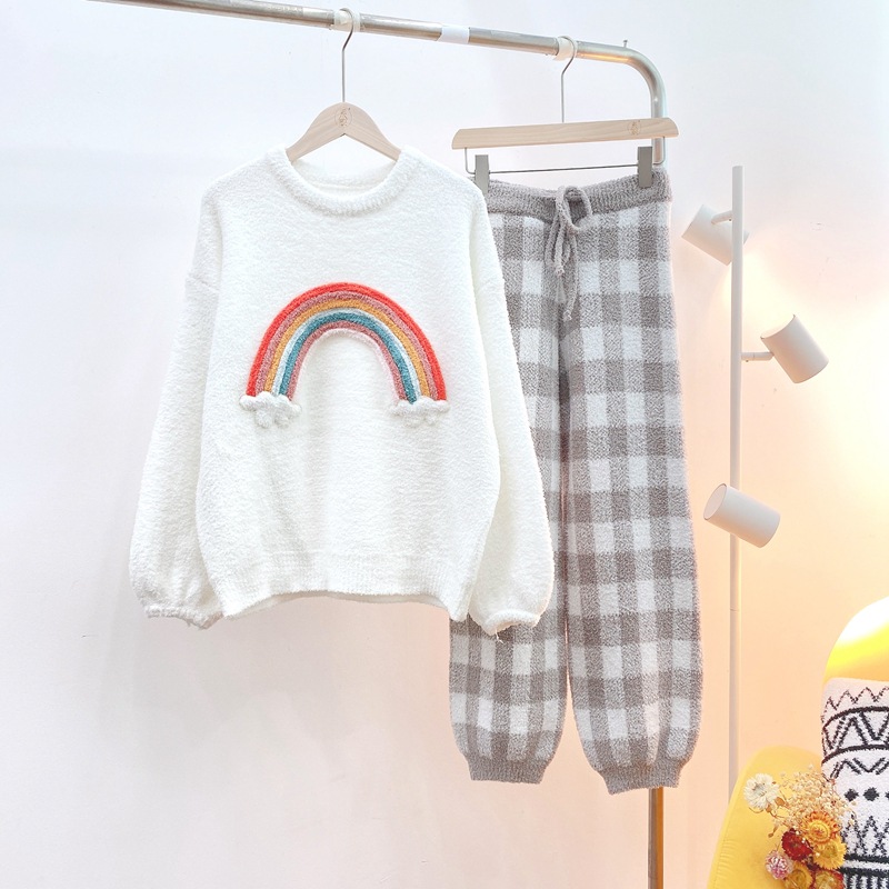 부드러운 잠옷 여자의 가을과 겨울 한국식 나이 감소 달콤한 만화 무지개 격자 무늬 따뜻한 투피스 가정 옷 세트스토어 가기