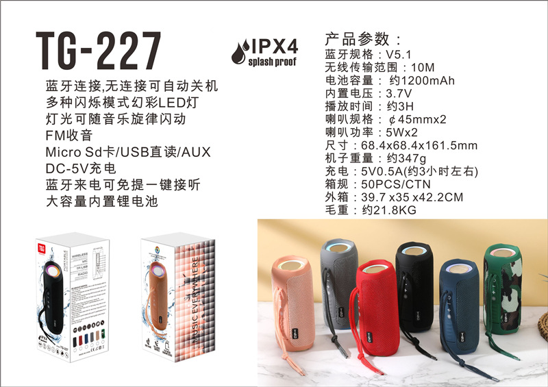 크로스 보더 새로운 TG227 방수 블루투스 스피커 카드 휴대용 led 블루투스 오디오 크리에이티브 선물 fm 소형 스피커