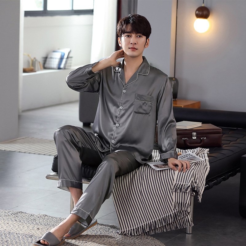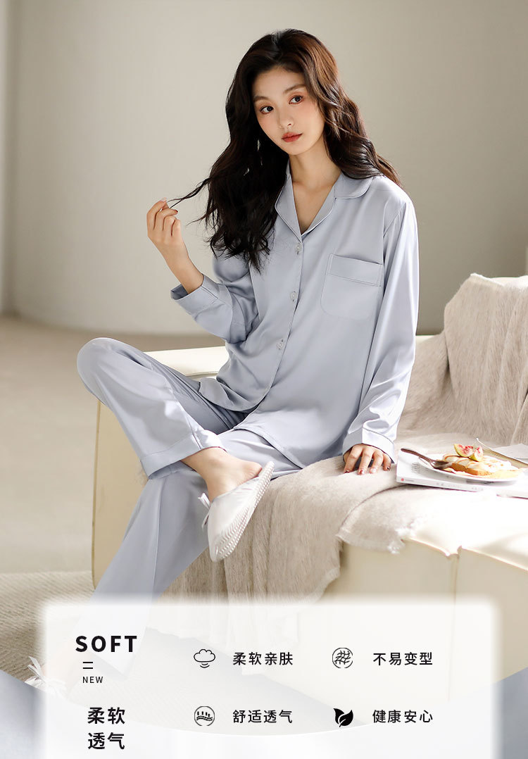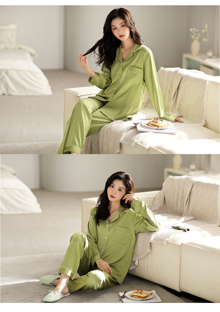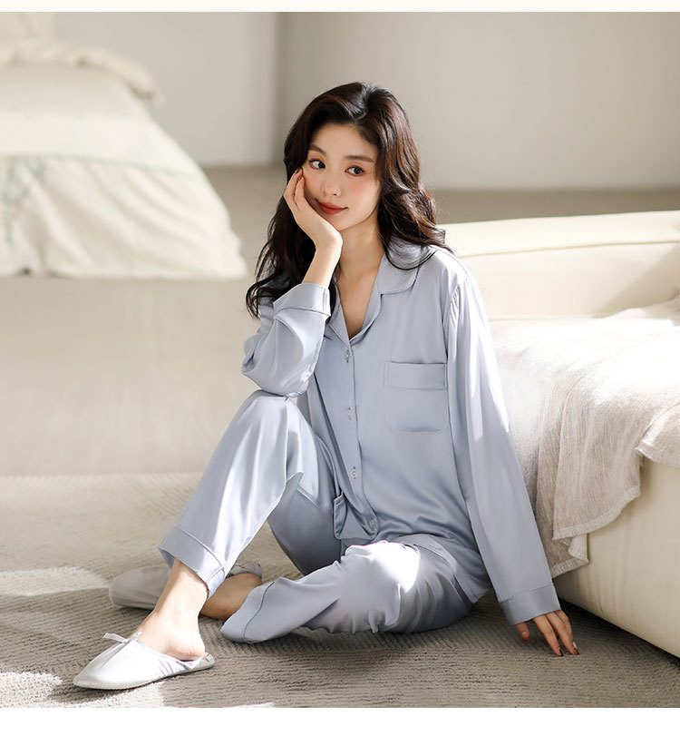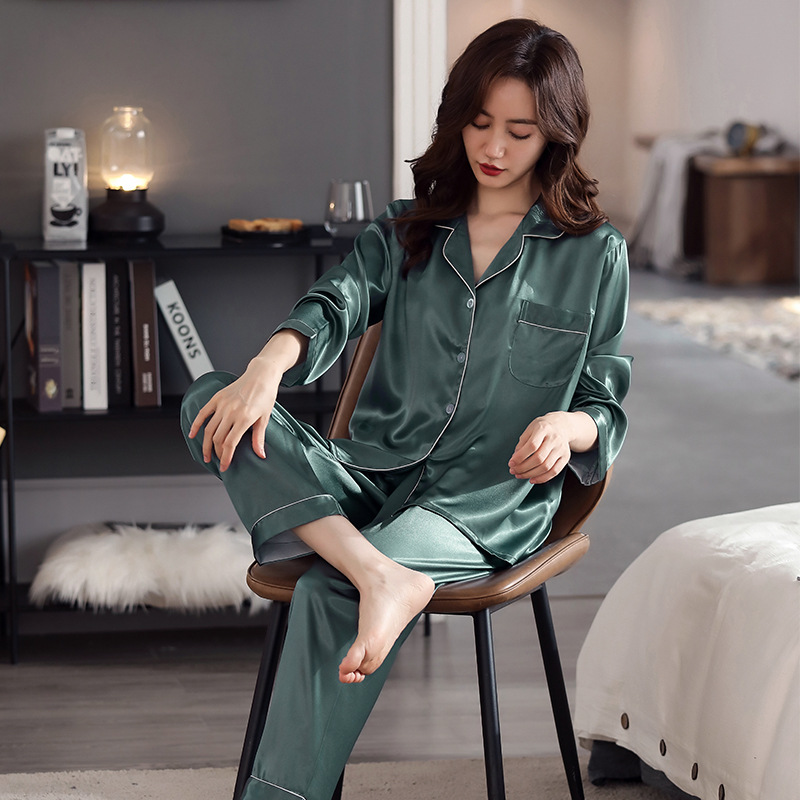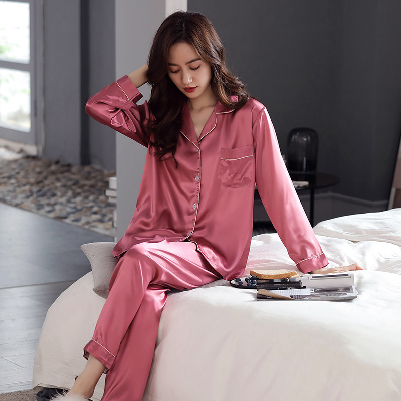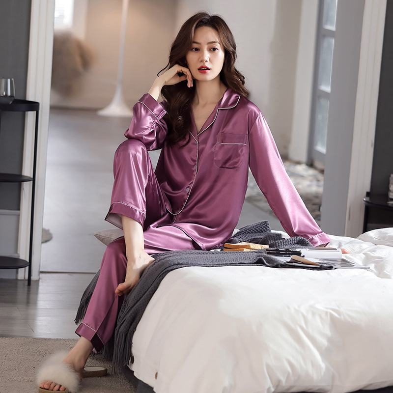 한 Yatong 새틴 아이스 실크 여자의 긴 소매 바지 봄과 여름 단색 가정 옷 세트 남자의 가을 잠옷 새로운스토어 가기