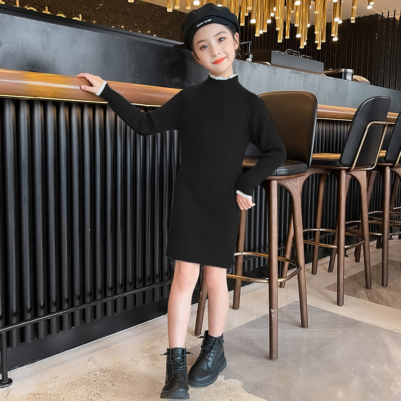 여아 중간 길이 레이스 스웨터 2021 새로운 어린이 겨울 서양 스타일 소녀의 두꺼운 기모 니트 베이스 셔츠