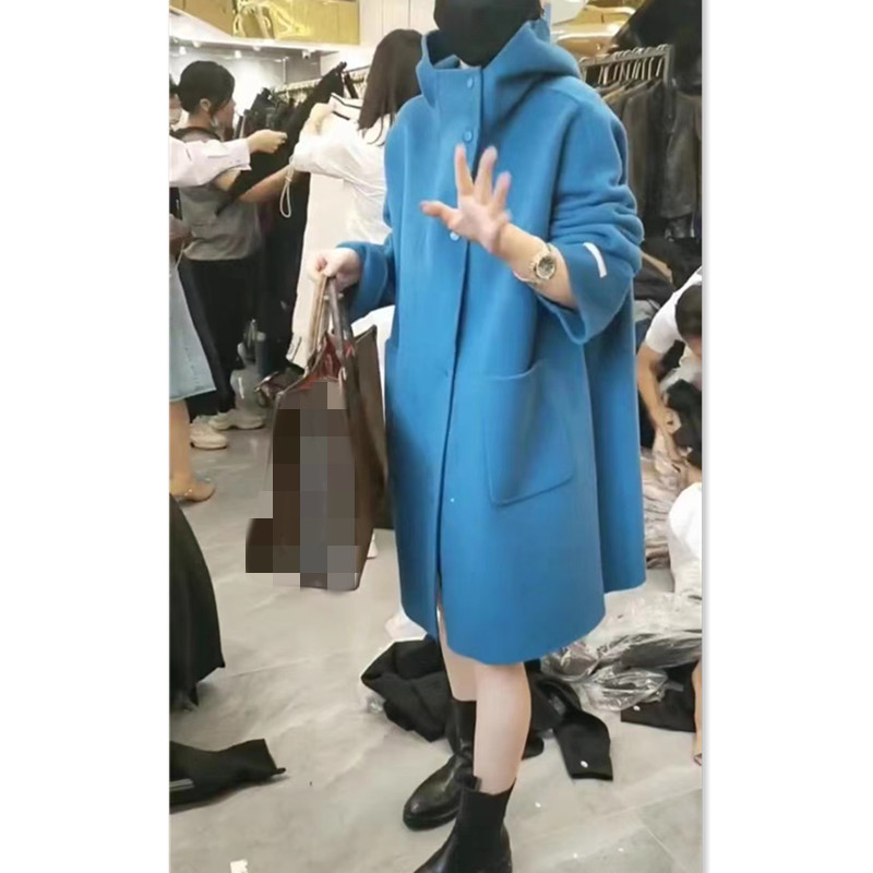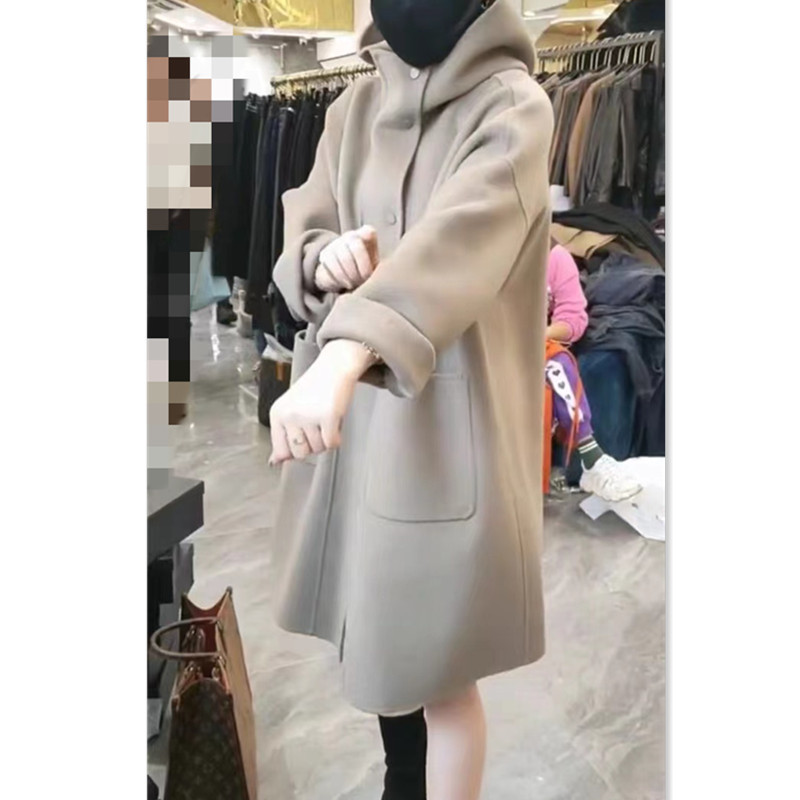 88055 Daai Mei Yiyuan 2025 가을 겨울 새로운 스타일 하이 넥 후드 모직 코트 중간 길이 느슨한 살을 덮는 여성스토어 가기