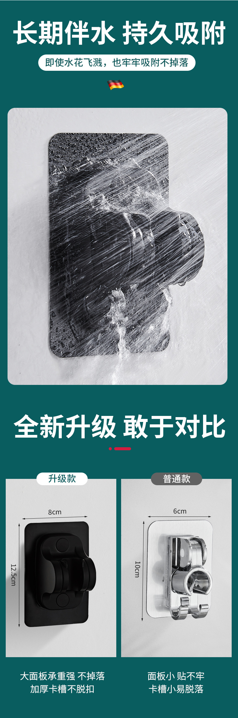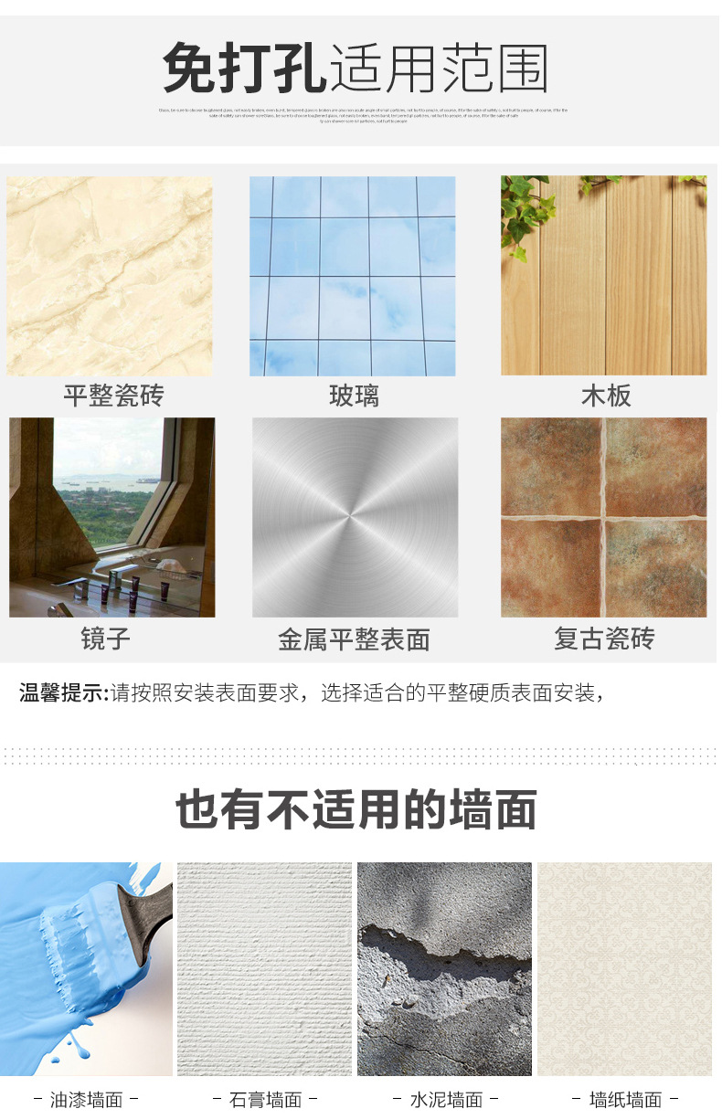 (2)安装请注意,墙面需平整坚固的玻璃瓷砖等。不可用在粉刷墙,墙纸,石灰墙等不平整不坚固的墙面上。上墙后,像手机贴膜一样,把贴片里的空气挤压出来就可以用了。