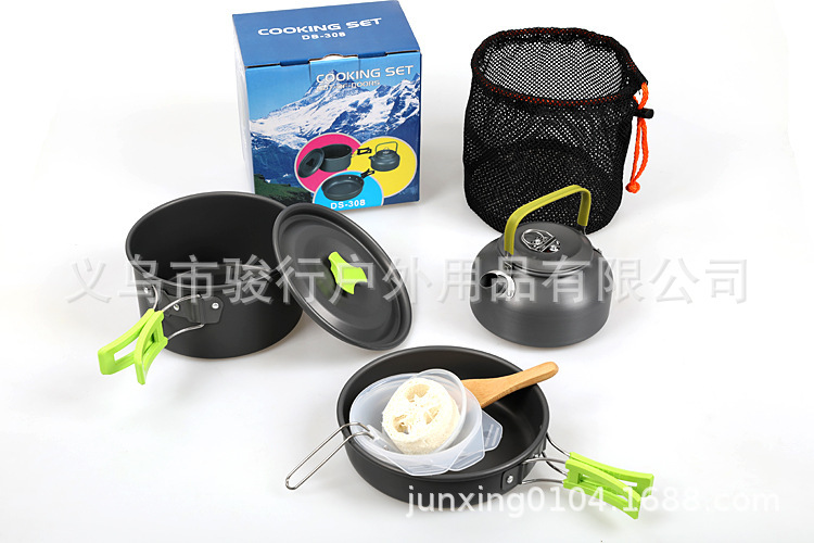 材质:采用优质铝材,硬质铝氧化,耐高温,耐磨擦。包括一个大锅,一小锅和煎锅,一汤匙,一饭勺,三小碗及一百洁球。汤匙,饭勺和碗采用安全食品级PP材质。布袋包装。适合2-3人使用。