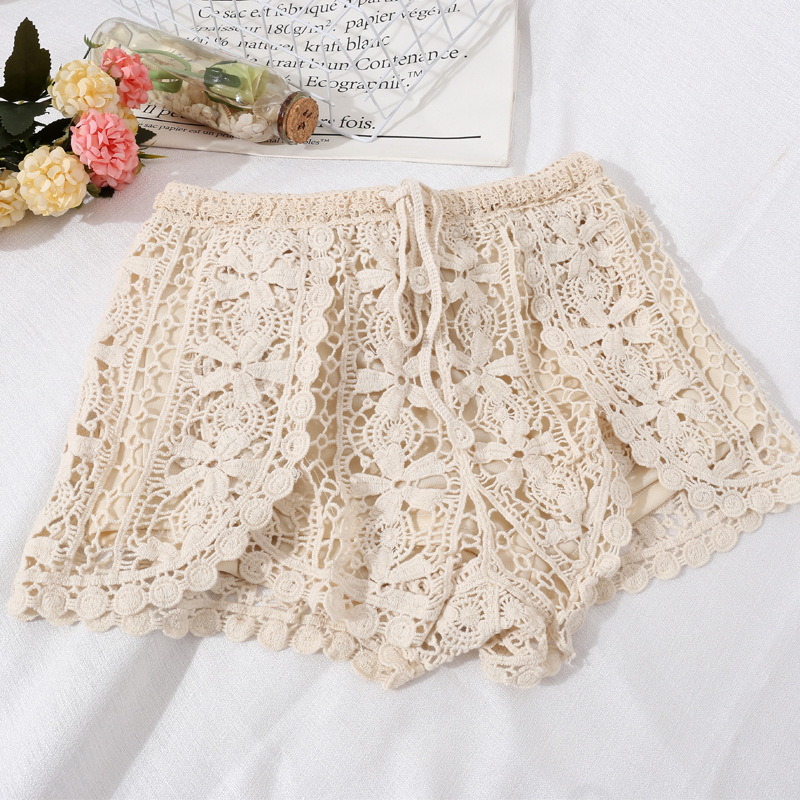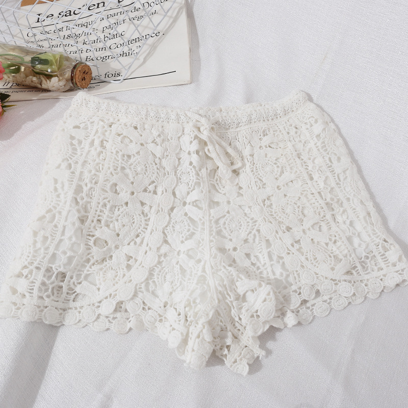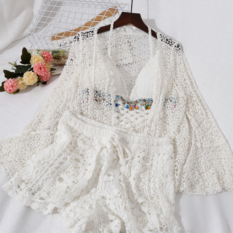새로운 해변 휴일 등이없는 레이스업 튜브 탑 조끼 + 캐주얼 반바지 + 중공 레이스 선크림 셔츠 3 종 세트스토어 가기