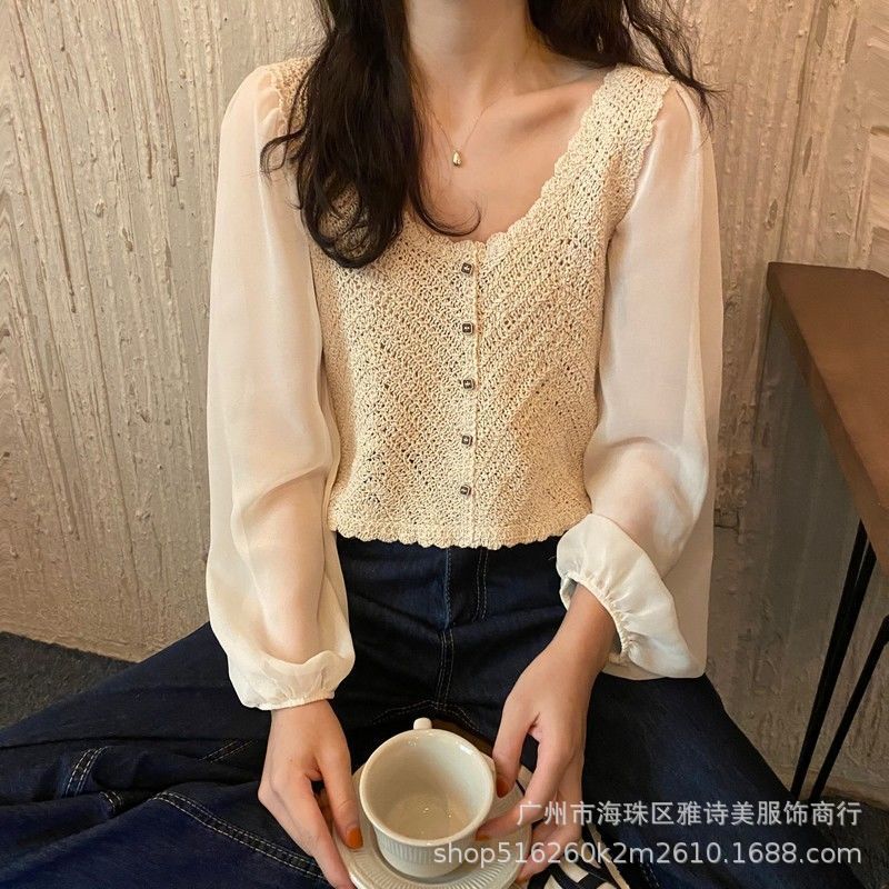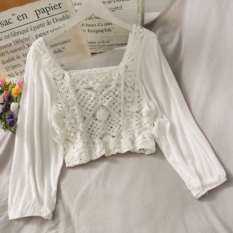 새로운 달콤한 크로 셰 뜨개질 중공 라운드 넥 쉬폰 셔츠 여성용 쇄골 하트 짧은 퍼프 슬리브 기본 셔츠 작은 셔츠