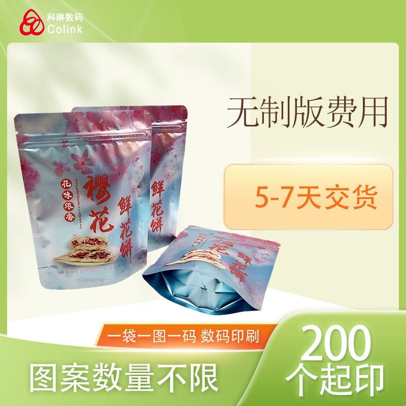 采用惠普Indigo 20000 数码无版印刷、无需制版费用、支持小批量多图案定制订单,量大价格从优,交货速度快,通常4-10天交货;烦请告知你需要定制的袋型,尺寸以及需要定制的数量,我们给你提供最准确的报价,详情咨询客服了解!