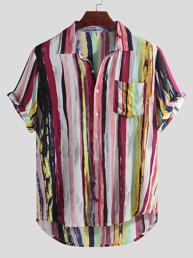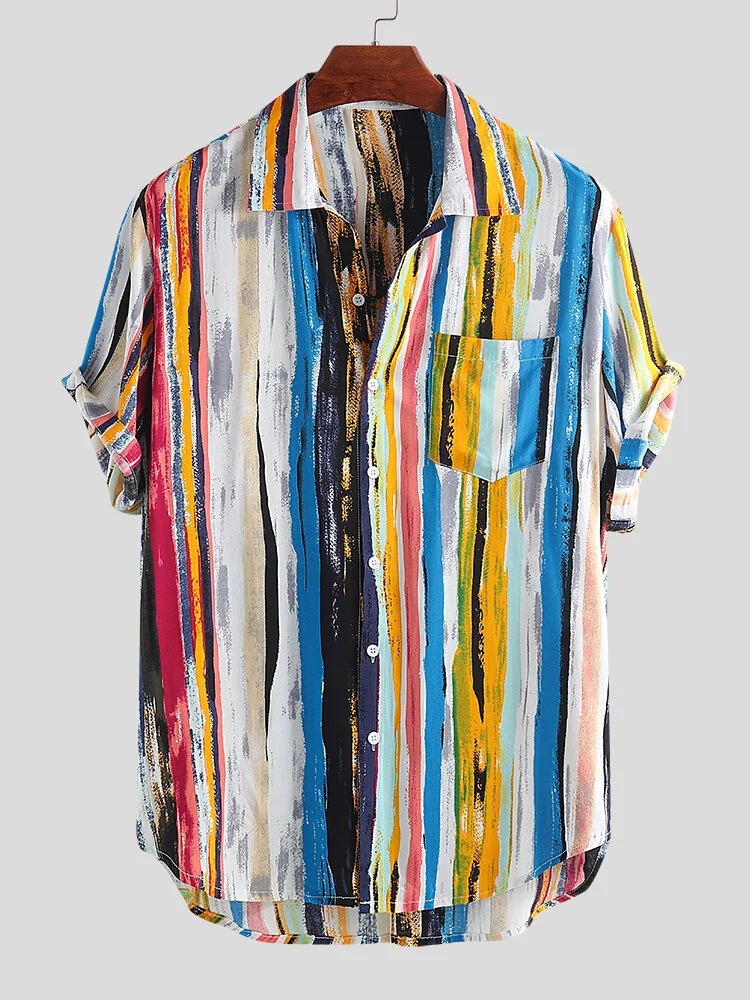 2025 여름 해외 무역 아마존 남성복 루즈핏 캐주얼 스트라이프 반팔 남성 셔츠 비치 프린트 셔츠스토어 가기