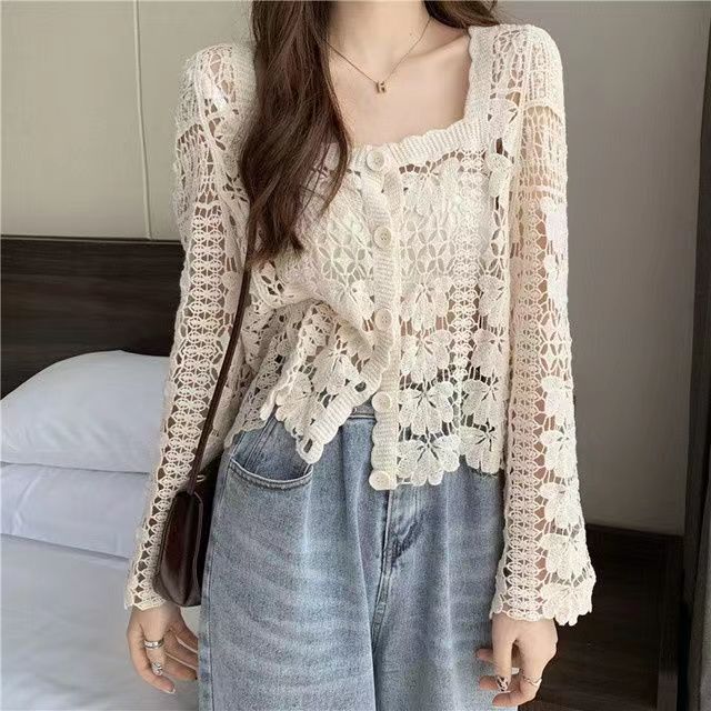 새로운 가을, 겨울 스퀘어 넥 스타일 중공 니트 카디건 여성의 게으른 스타일 디자인 루즈하고 다재다능한 작은 셔츠와 재킷 유행