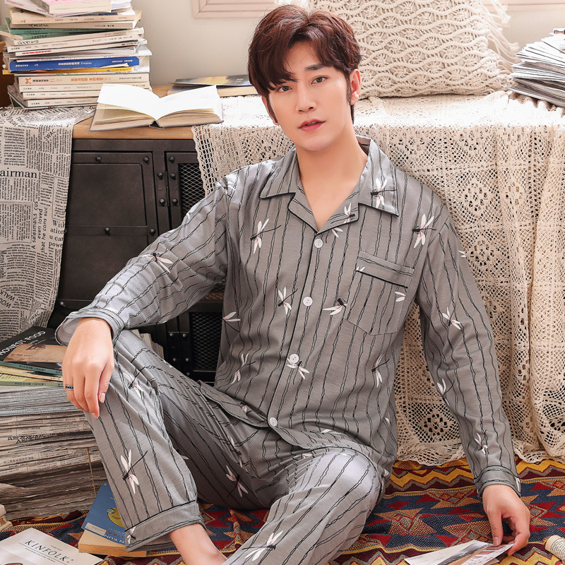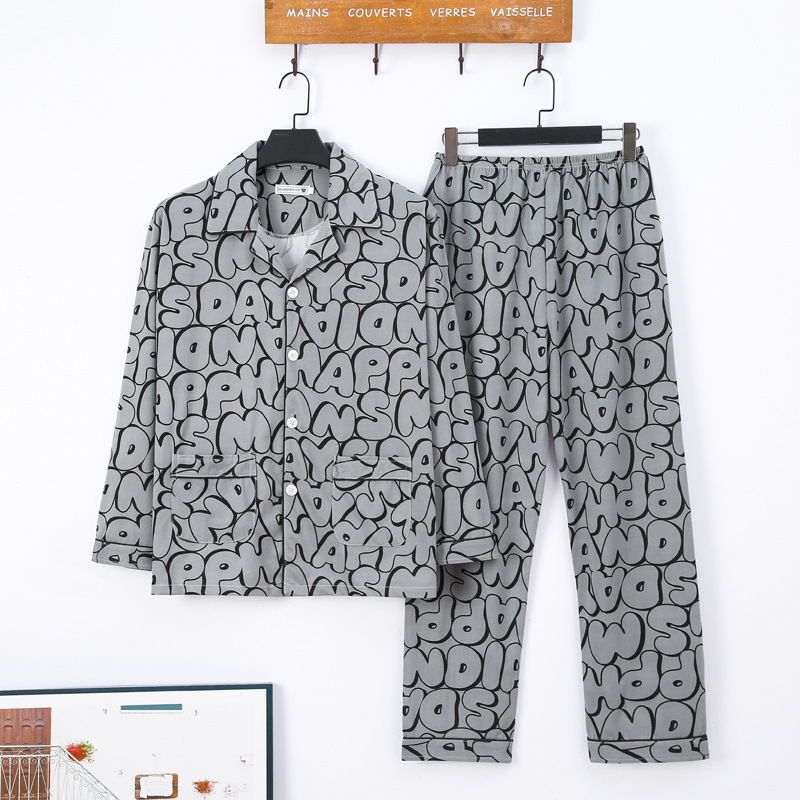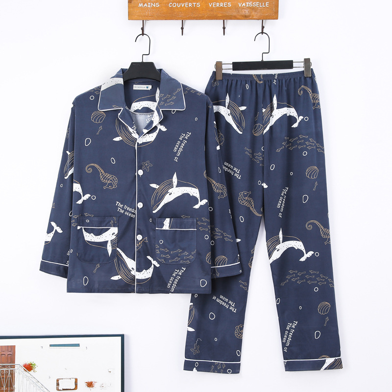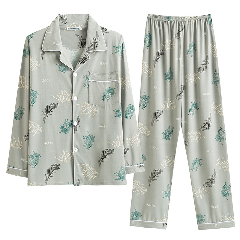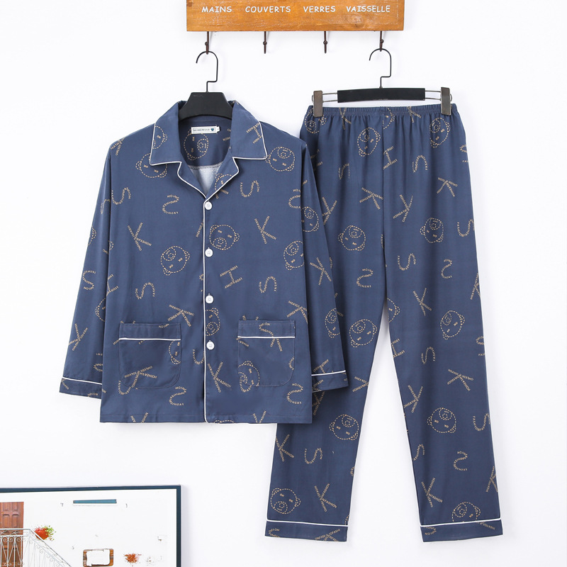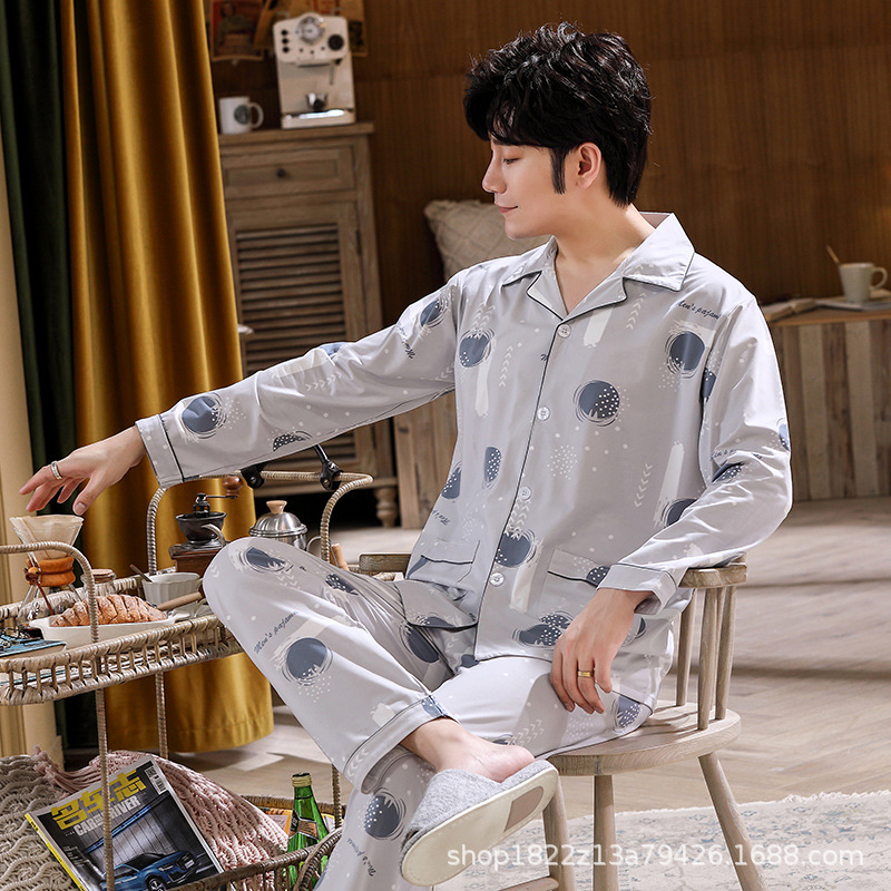 남자의 봄과 가을 겨울 잠옷 남자의 도매 인쇄 긴 소매 카디건 옷깃 니트 면 가정 옷 세트 크로스 보더스토어 가기
