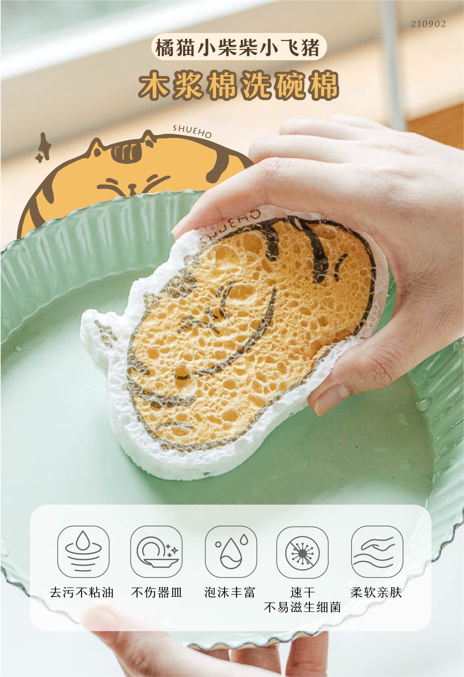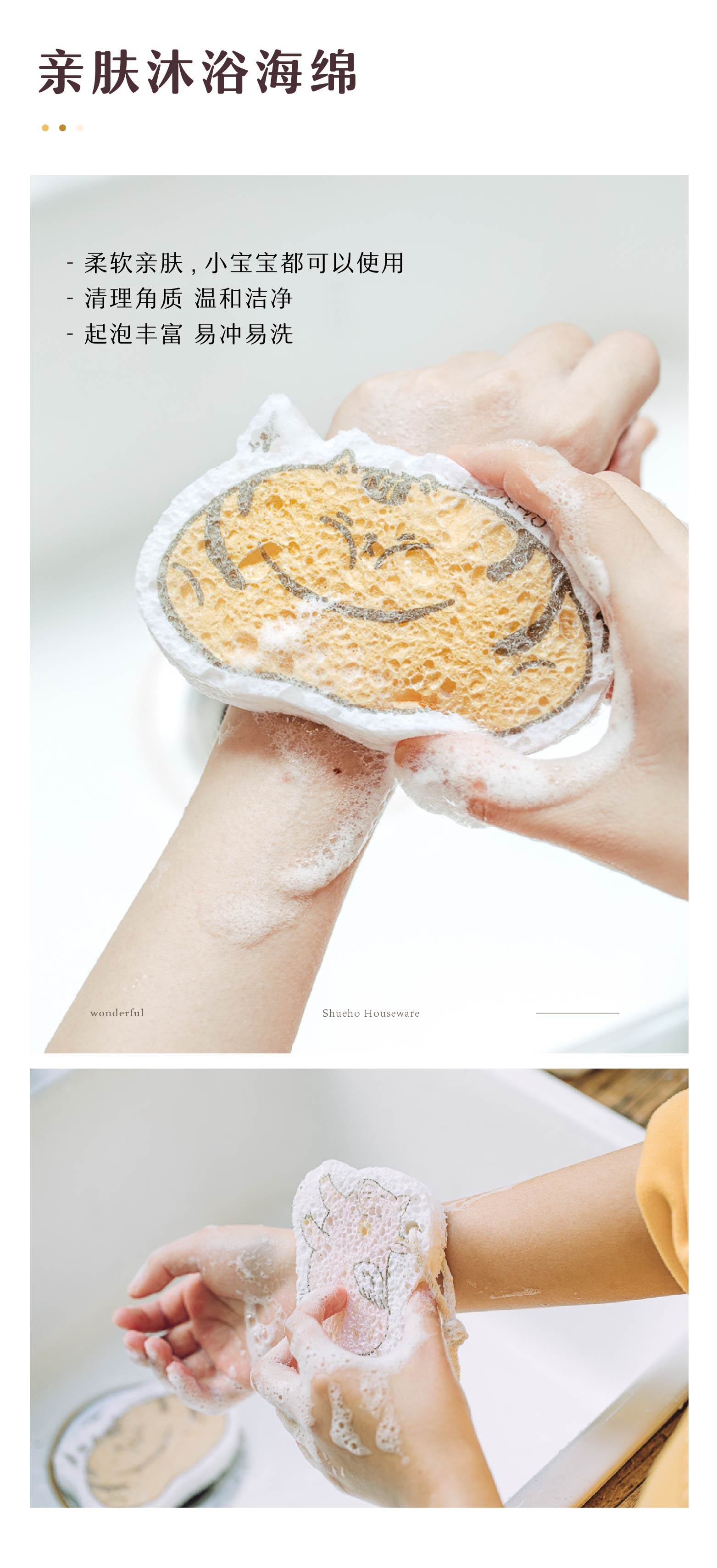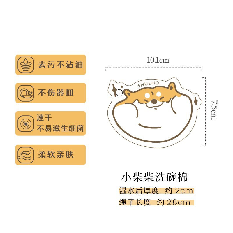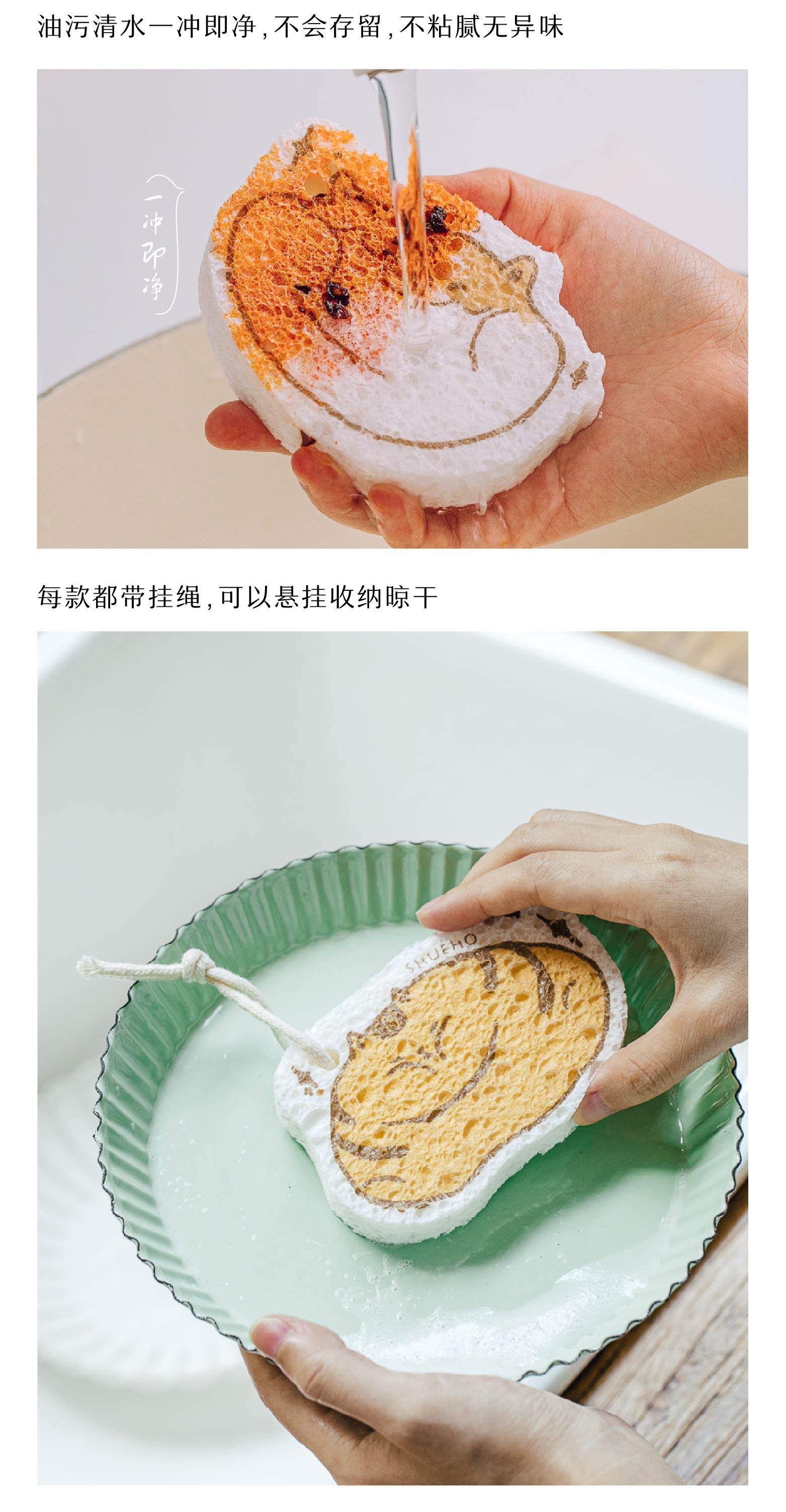 胖胖小橘、小柴柴和小飞猪是我们设计出来的图案,让你边洗边Rua,家务也可以是轻松有趣的。设计了挂绳款,可以悬挂收纳晾干,更贴心。这个系列的木浆棉是树可原创设计,并已申请版权登记。