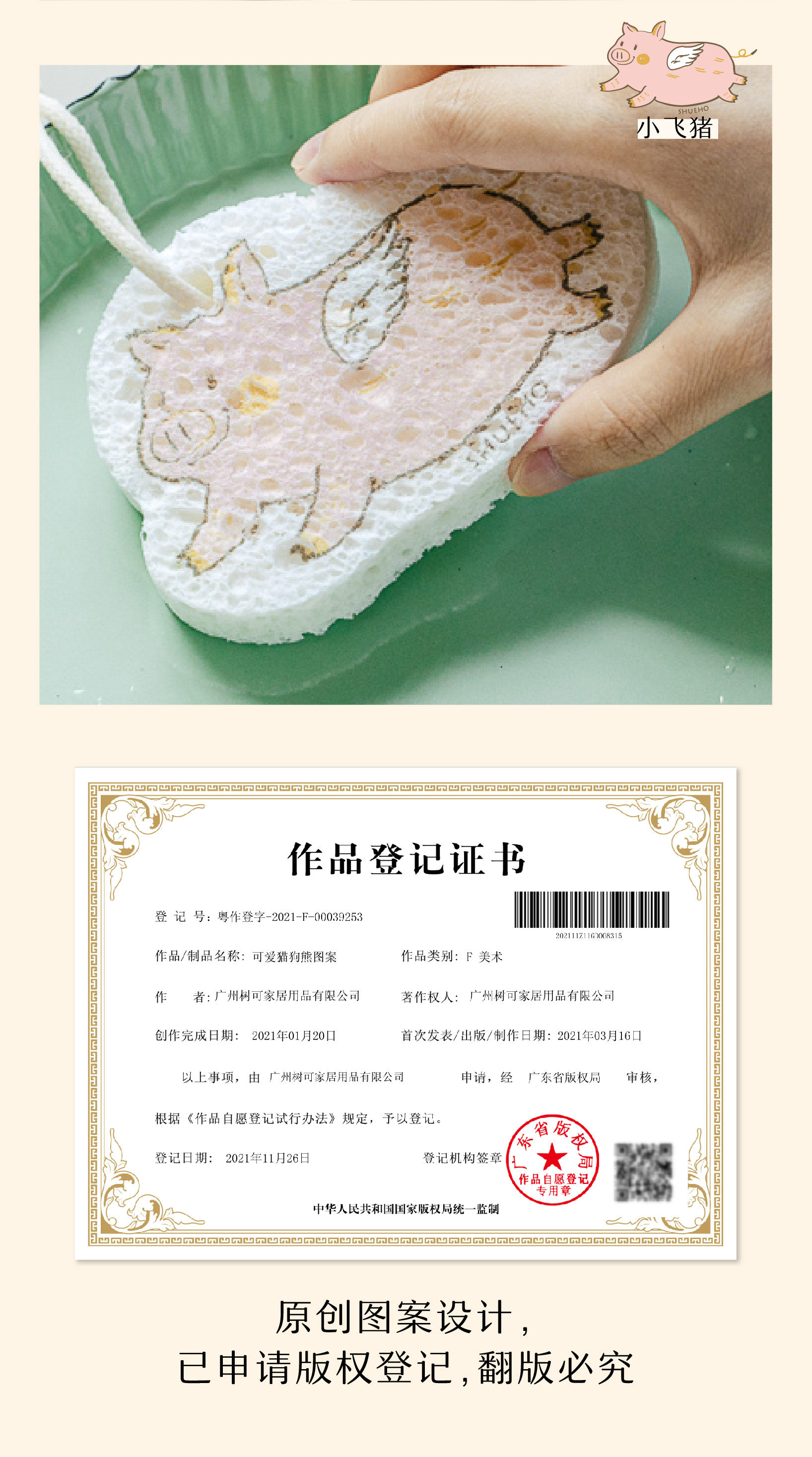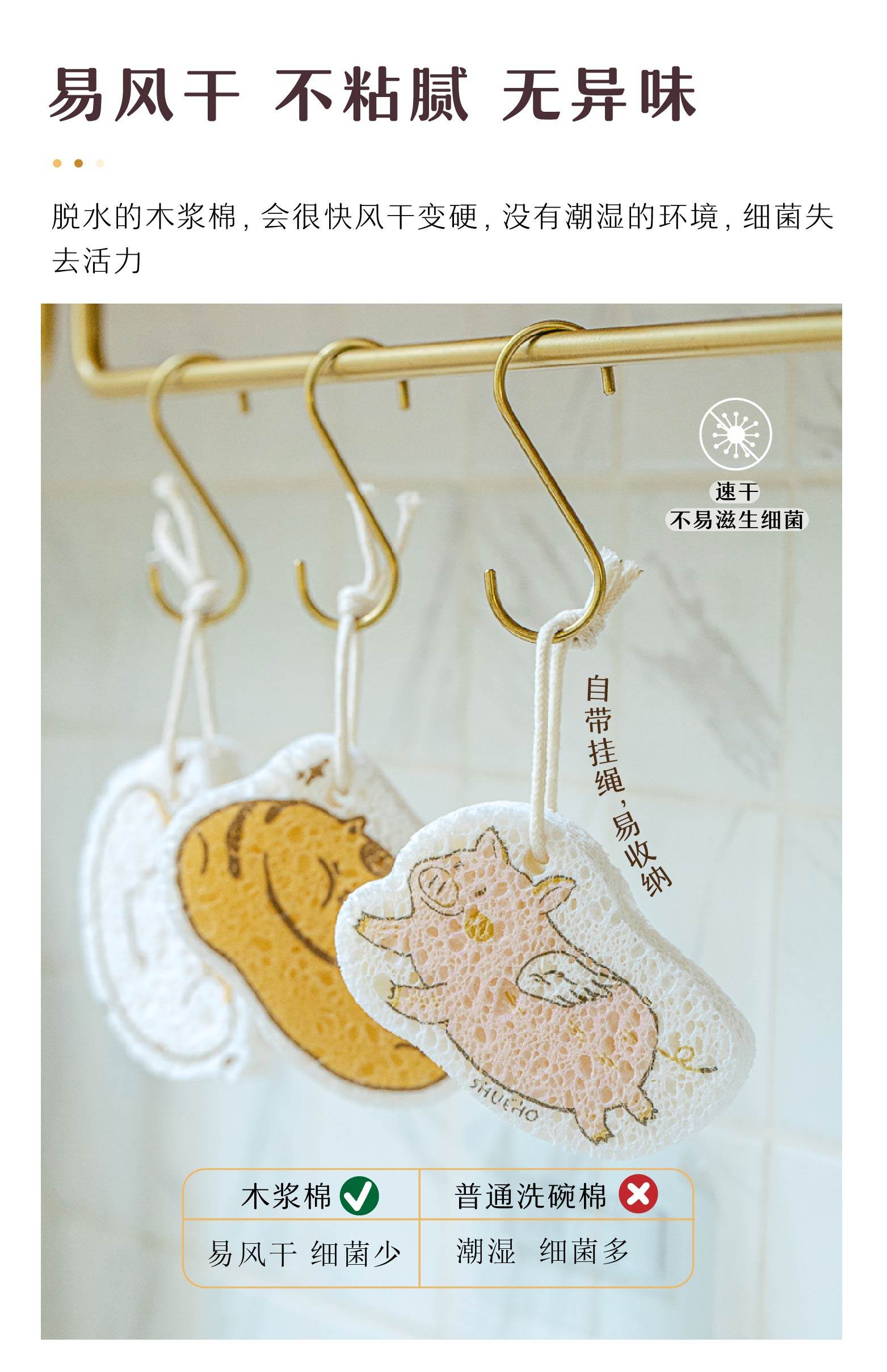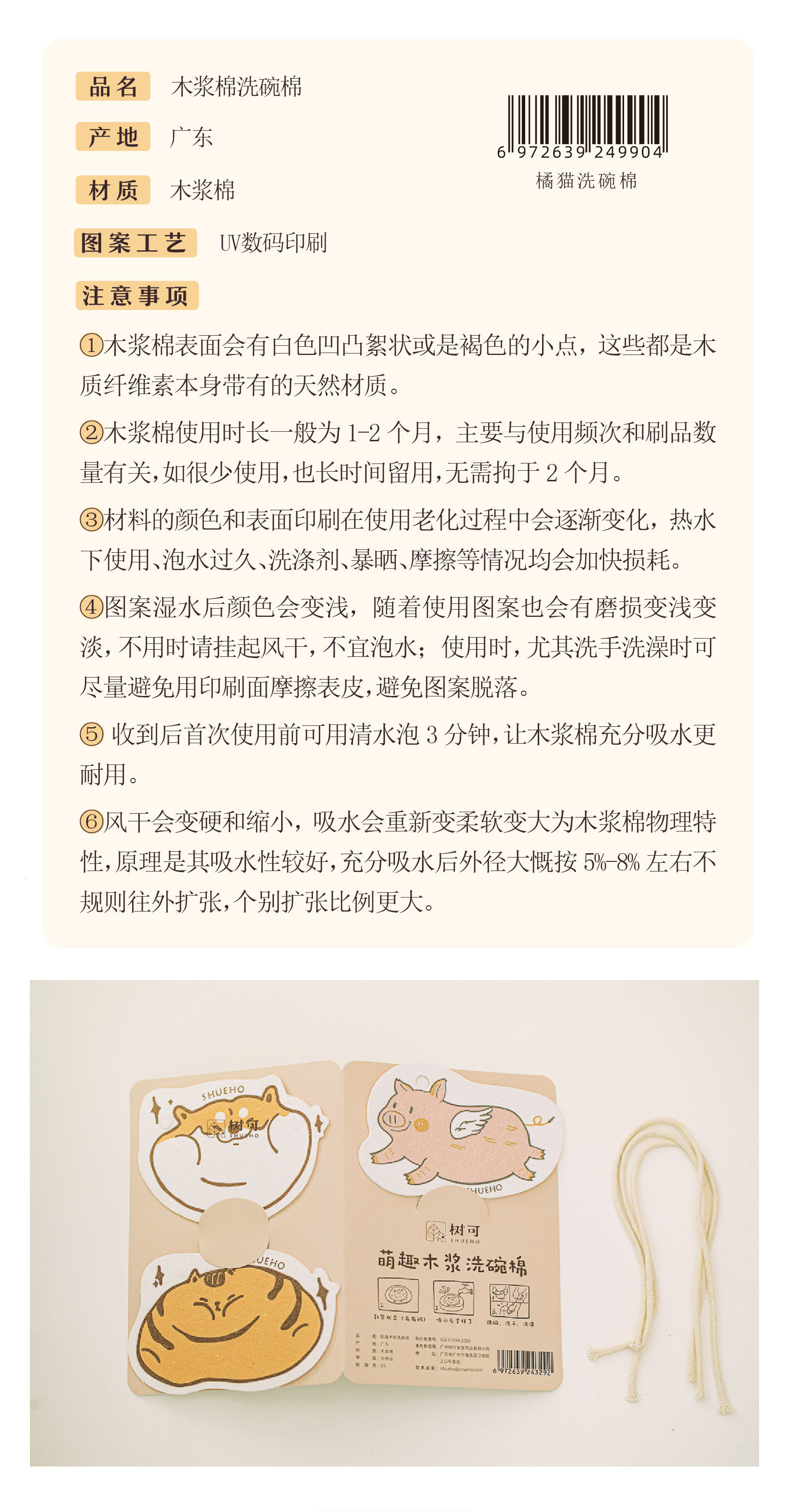 胖胖小橘、小柴柴和小飞猪是我们设计出来的图案,让你边洗边Rua,家务也可以是轻松有趣的。设计了挂绳款,可以悬挂收纳晾干,更贴心。这个系列的木浆棉是树可原创设计,并已申请版权登记。