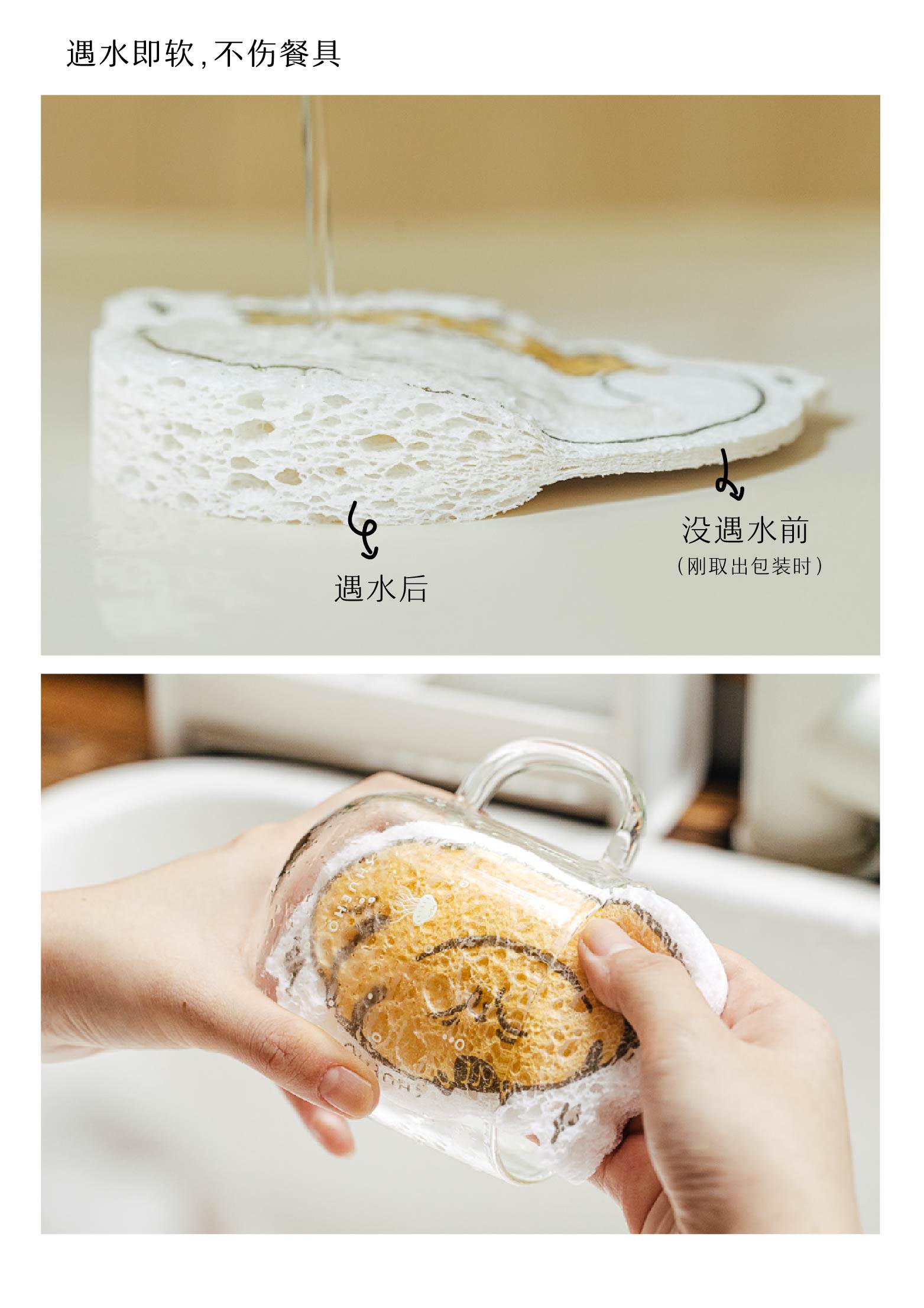木浆棉很特别,脱水的状态下会收缩变干变硬,吸水了会迅速膨胀,变得柔软有弹性。膨胀起来的木浆棉有很多蜂巢状的孔洞,很容易起泡,加一点点清洁剂轻轻揉搓就会有丰富的泡沫,然后也不粘油污,清水一冲,油污分离,所以很适合用来做洗碗棉。