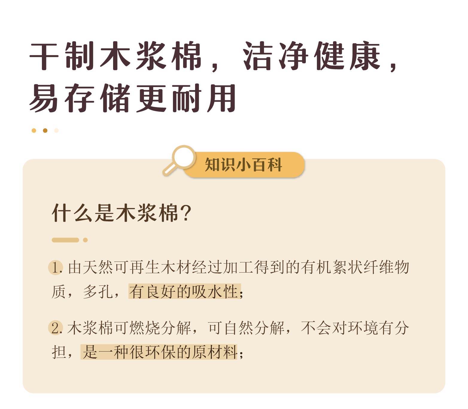 树可木浆棉采用干棉工艺,木浆棉原料压缩、裁制、印刷,全程在洁净的工厂中完成。成品干净健康,轻巧便携,更耐用环保。”