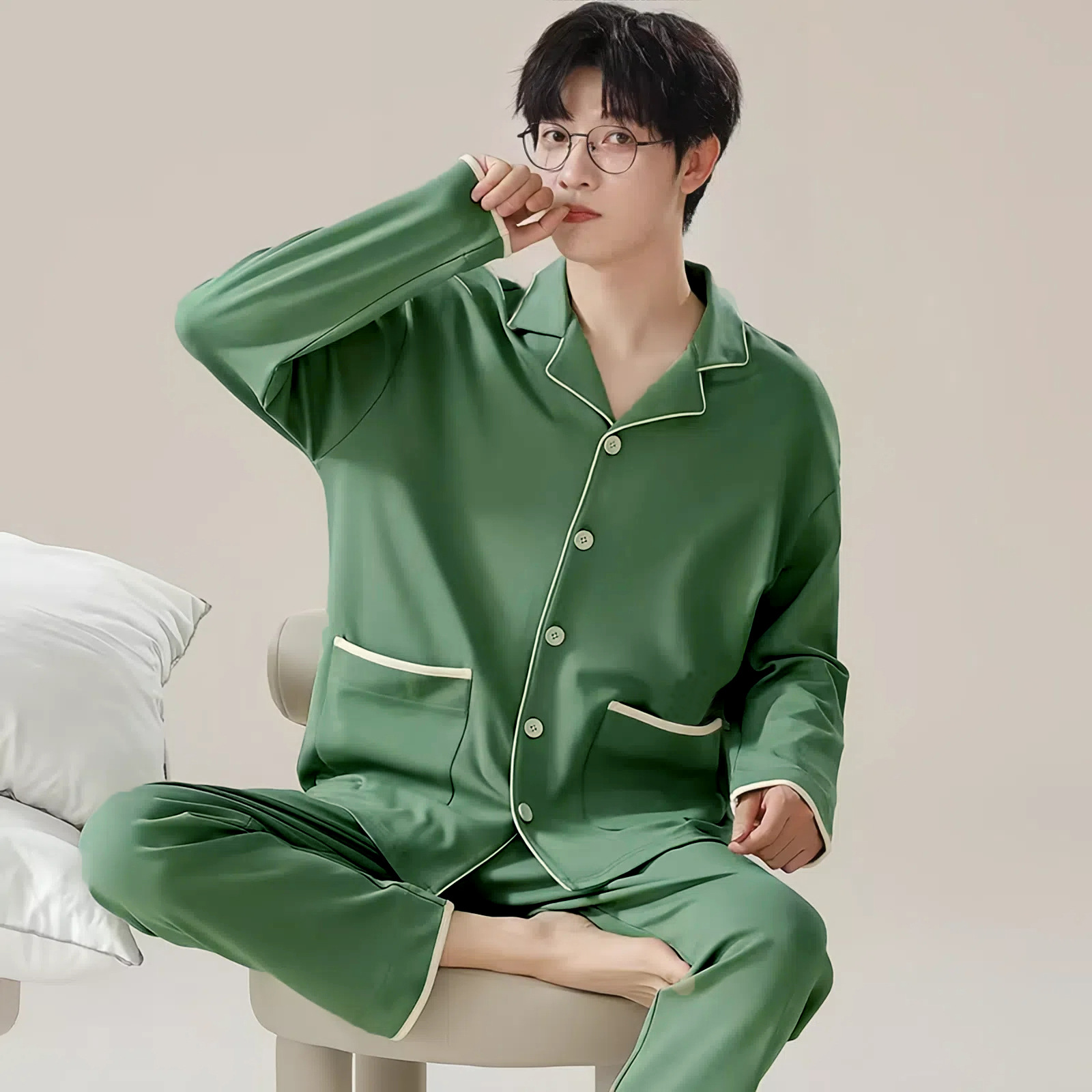 잠옷 남자의 긴팔 면 봄과 가을 여름 남자의 면 남자의 얇은 녹색 중년 카디건 가정 의류 세트스토어 가기