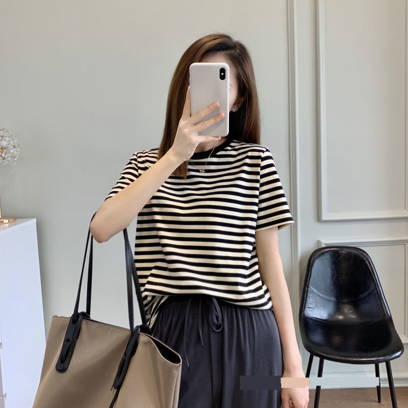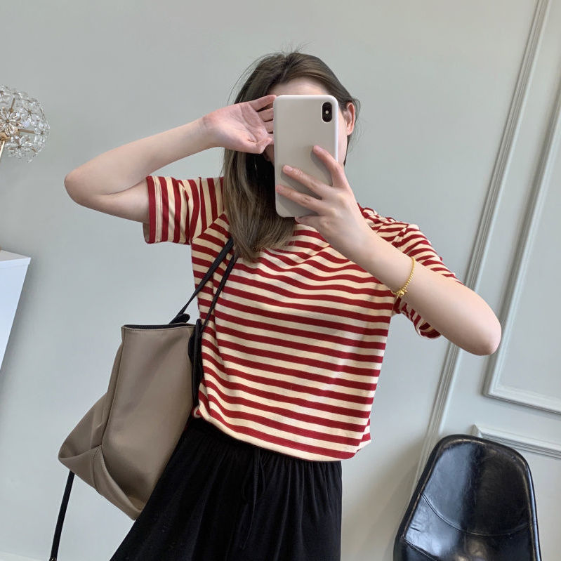 빨간색과 흰색 줄무늬 티셔츠 여성용 반팔 2024년 여름 신상품 나이를 줄여주는 루즈핏 스타일리시한 화이트 탑 트렌디 인스타그램 인기스토어 가기