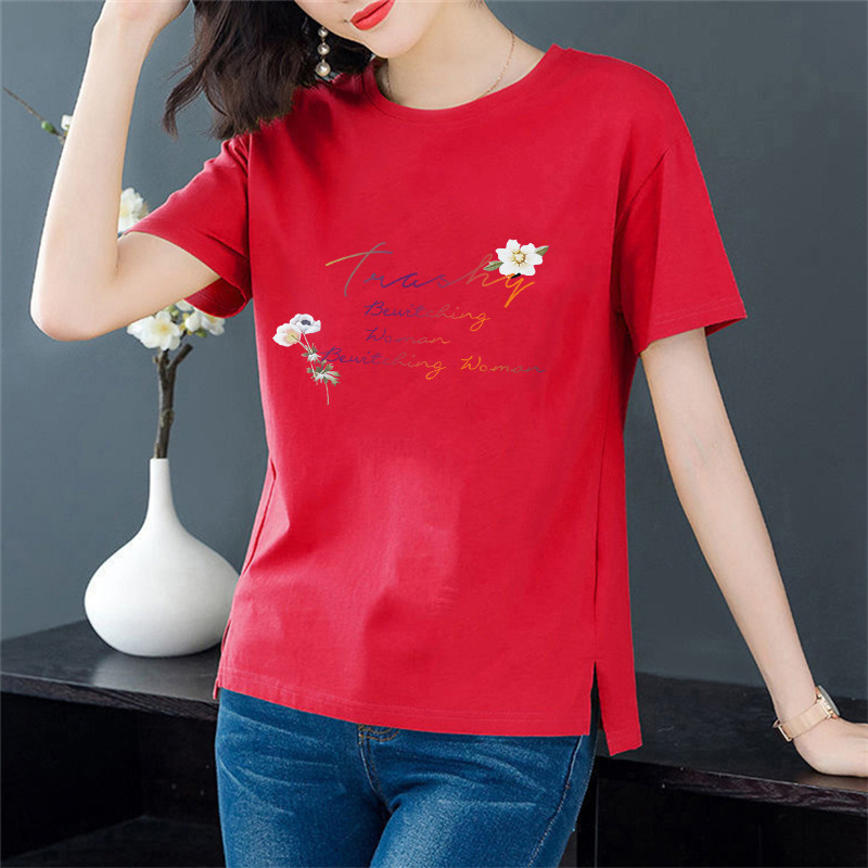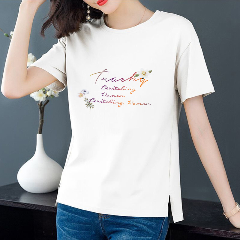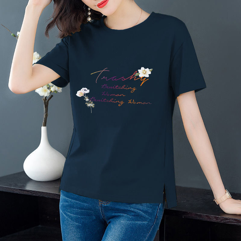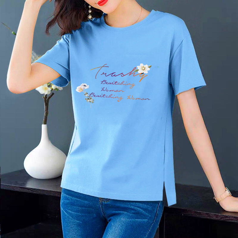 공장 맞춤형 지원 플레이트 라운드 넥 반소매 프린트 티셔츠 여성용 느슨한 우아한 탑 풀오버 스플릿 베이스 셔츠스토어 가기